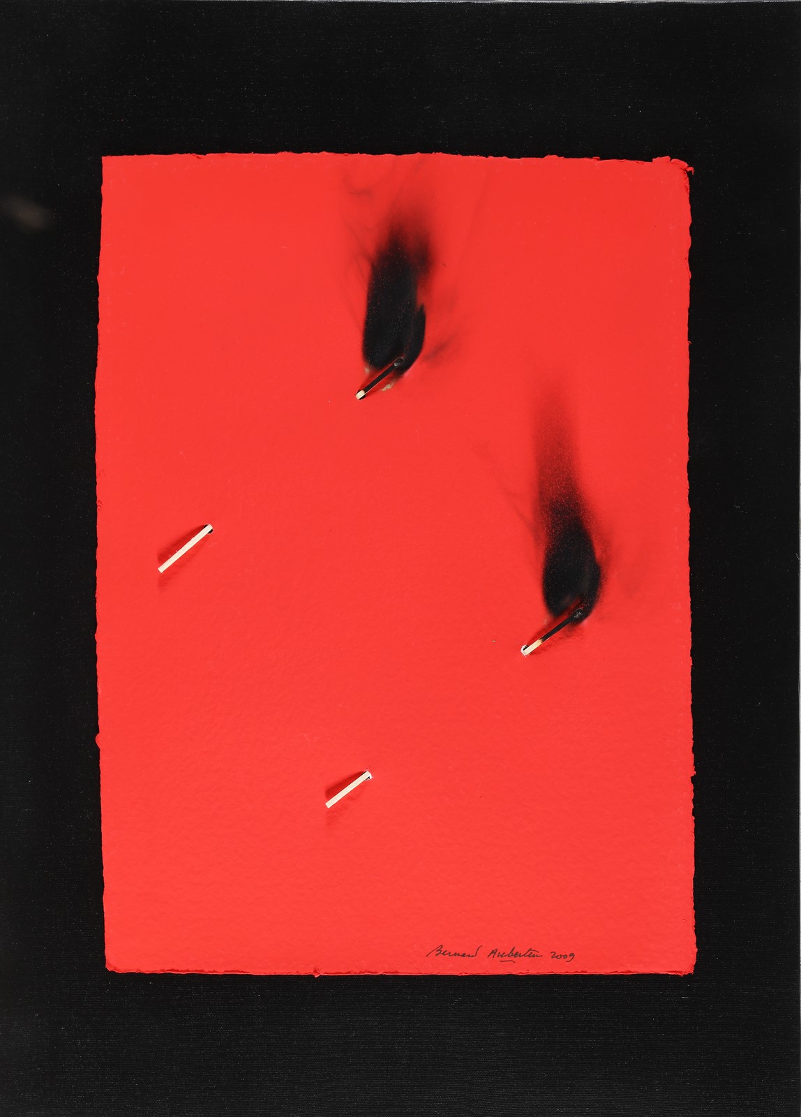 AUBERTIN BERNARD (n. 1934) Papier Rouge Brulé. 2009. Fiammiferi bruciati su carta. Cm 36,00 x 50,00. Firma e anno in basso a destra. Autentica dell'artista su fotografia a cura dell'Archivio Nordest, Seregno riportante il relativo numero d'inventario. Pubblicazioni: Bernard Aubertin - Dessins de Feu sur Papier a cura dell'Archivio Nordest, Seregno, testi di Flaminio Gualdoni, Piazza Dante Editore, 2012, pag. 134, tav.68.