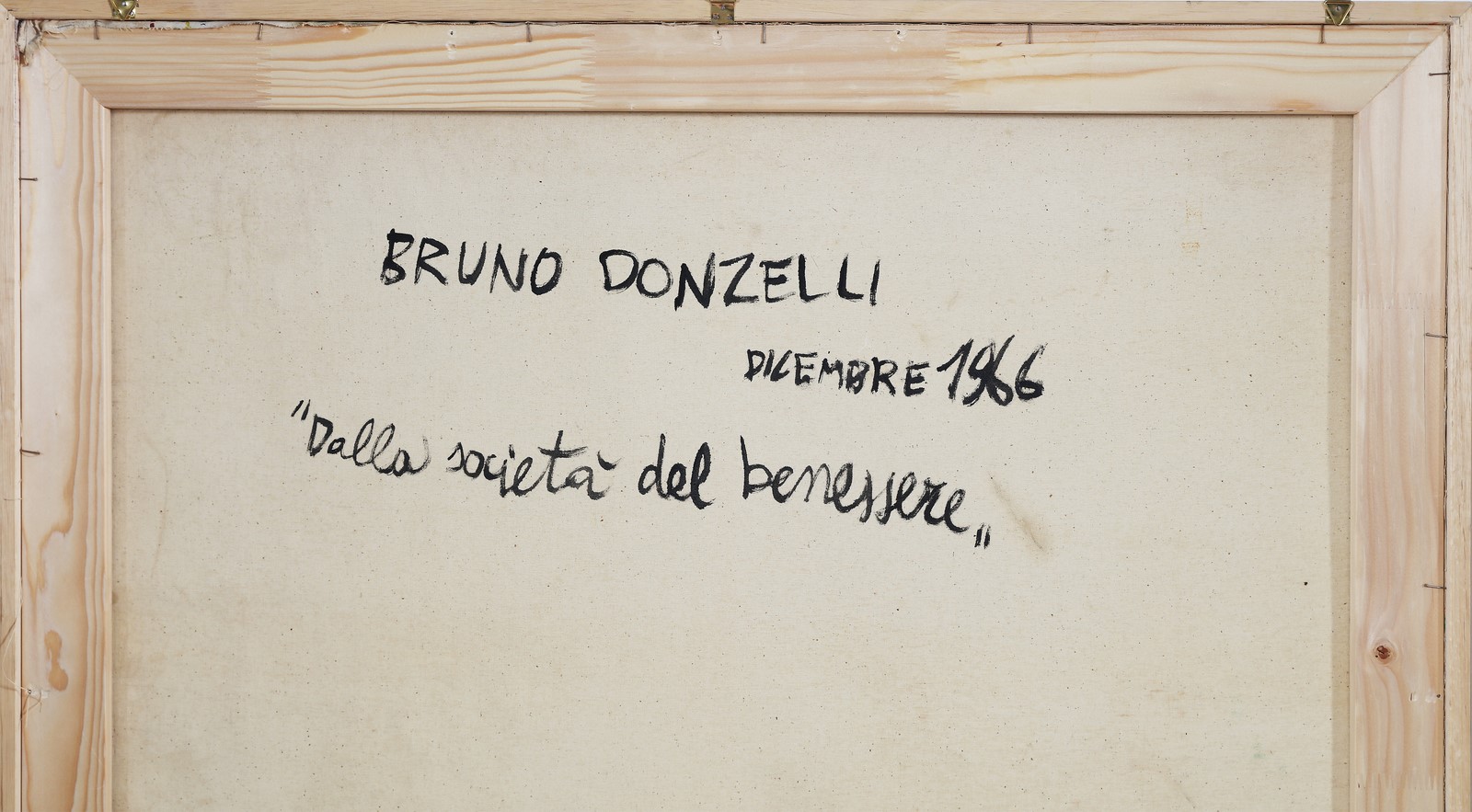 DONZELLI BRUNO (n. 1941) Dalla società del benessere. 1966. Tecnica mista su tela. Cm 100,00 x 90,00. Firma e anno in basso a destra. Al retro titolo, firma e anno. Autentica dell'artista su fotografia.