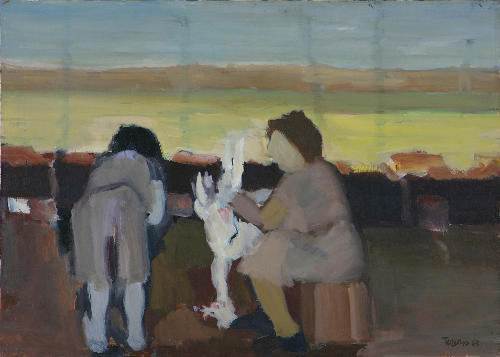 TERRUSO SAVERIO (1939 - 2003) Contadine. 1965. Olio su tela . Cm 70,00 x 50,00. Opera archiviata presso l'Archivio Generale delle Opere di Saverio Terruso.Satena s.n.c, Milano, come da documentazione fotografica allegata all'opera riportante il relativo n. d'inventario. Al retro firmato Saverio Terruso, P. Sant Agostino 2, Milano