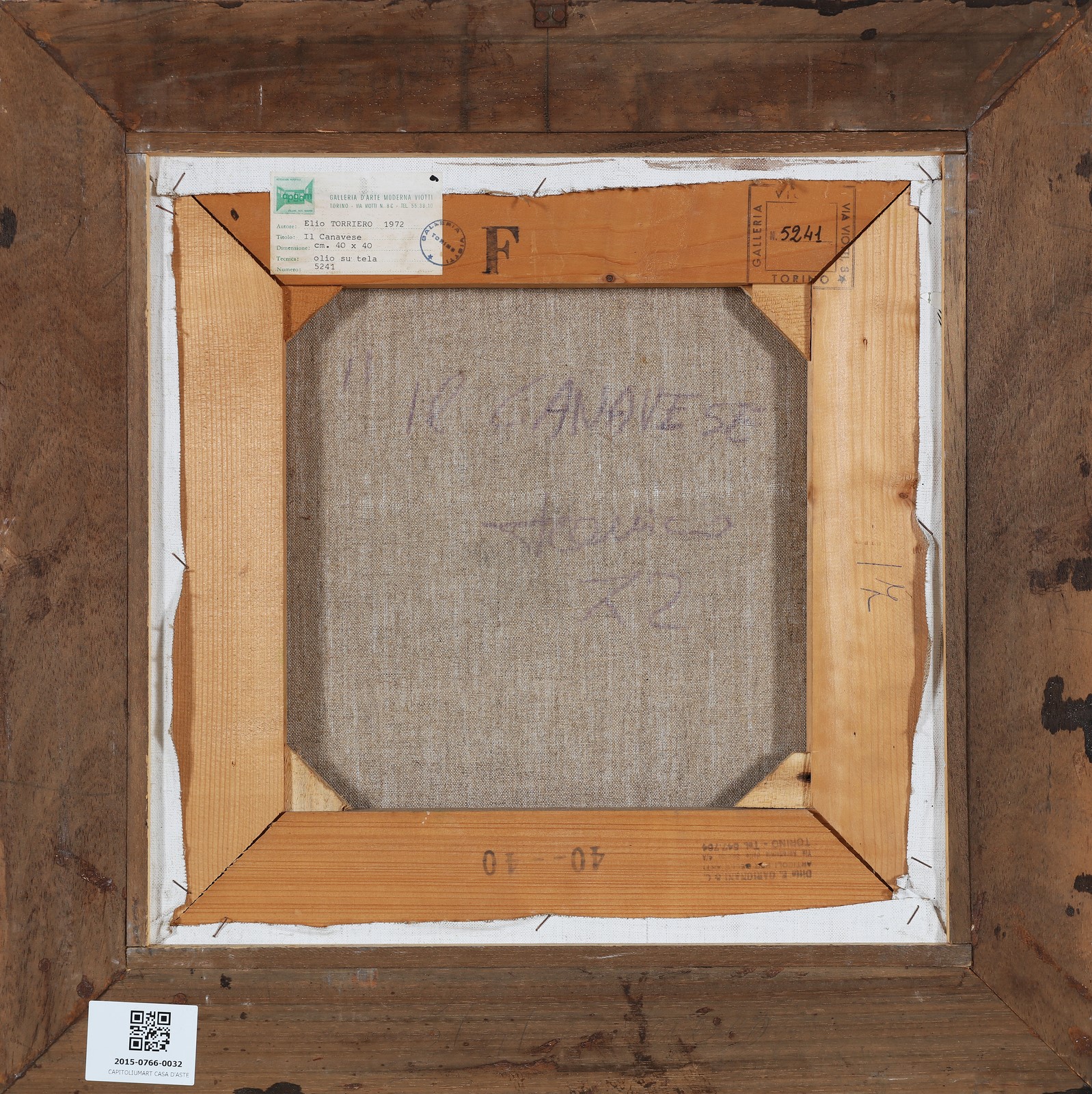 TORRIERO ELIO (n. 1945) Il Canavese. 1972. Tecnica mista su tela. Cm 40,00 x 40,00. Firma e anno in basso al centro. Al retro, titolo, firma e anno. Cartiglio descrittivo e timbro a cura della Galleria d'Arte Viotti, Torino. Cornice presente