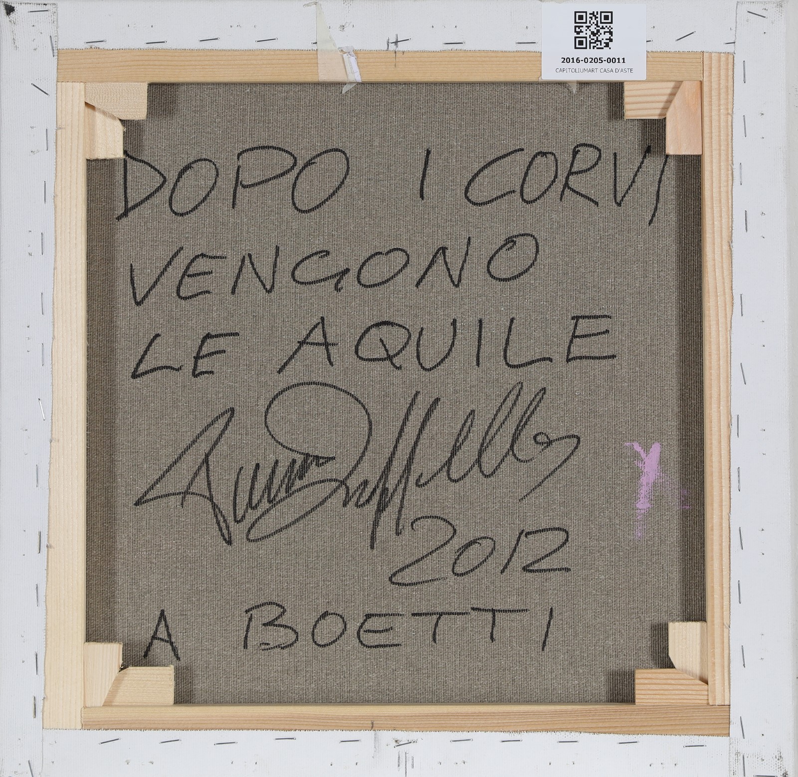 ZAPPELLA PIERINO (n. 1946) Dopo i corvi vengono le aquile. 2012. Tecnica mista su tela. Cm 40,00 x 40,00. Al retro firma, titolo, anno e dedica.