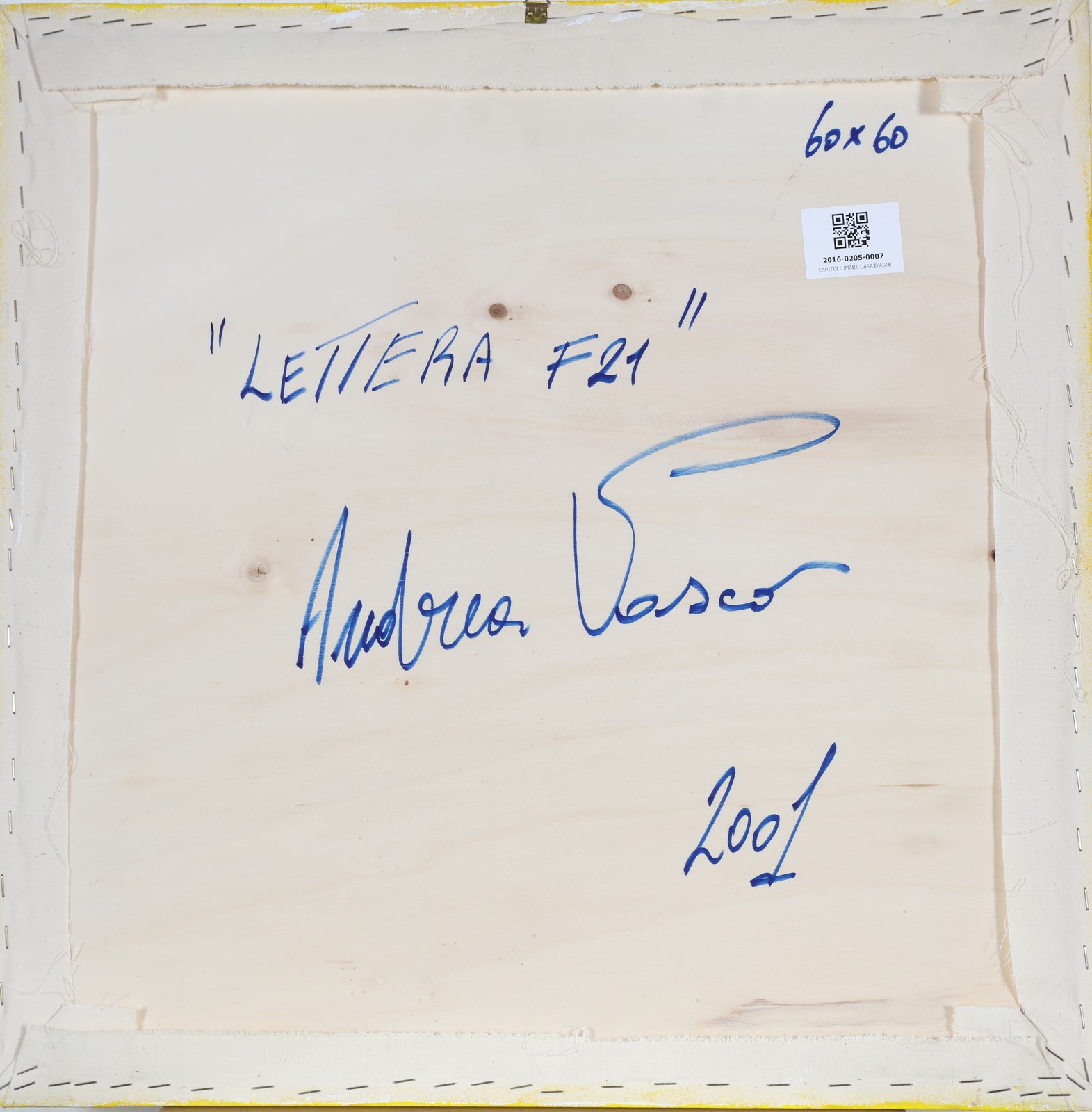 VASCO ANDREA (XXI SEC.) Lettera F21. 2001. Acrilico su tela estroflessa. Cm 60,00 x 60,00. Al retro titolo, firma e anno. Autentica dell'artista su fotografia.