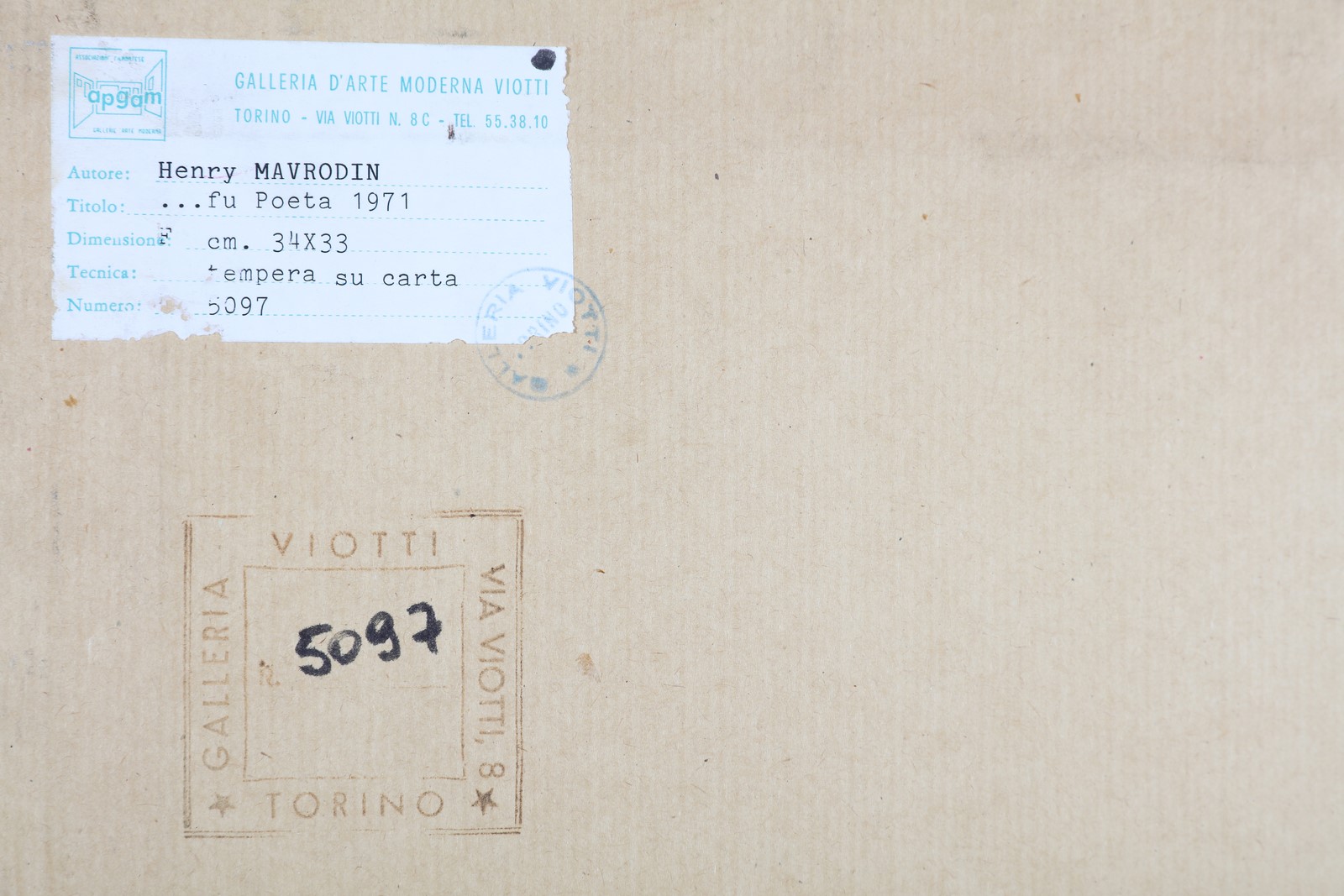 MAVRODIN HENRY (n. 1937) Fu poeta. 1971. Tempera su carta. Cm 33,00 x 34,00. Firma e anno in alto a sinistra. Al retro Cartiglio Descrittivo e Timbro a cura della Galleria d'Arte Moderna Viotti, Torino. Cornice presente