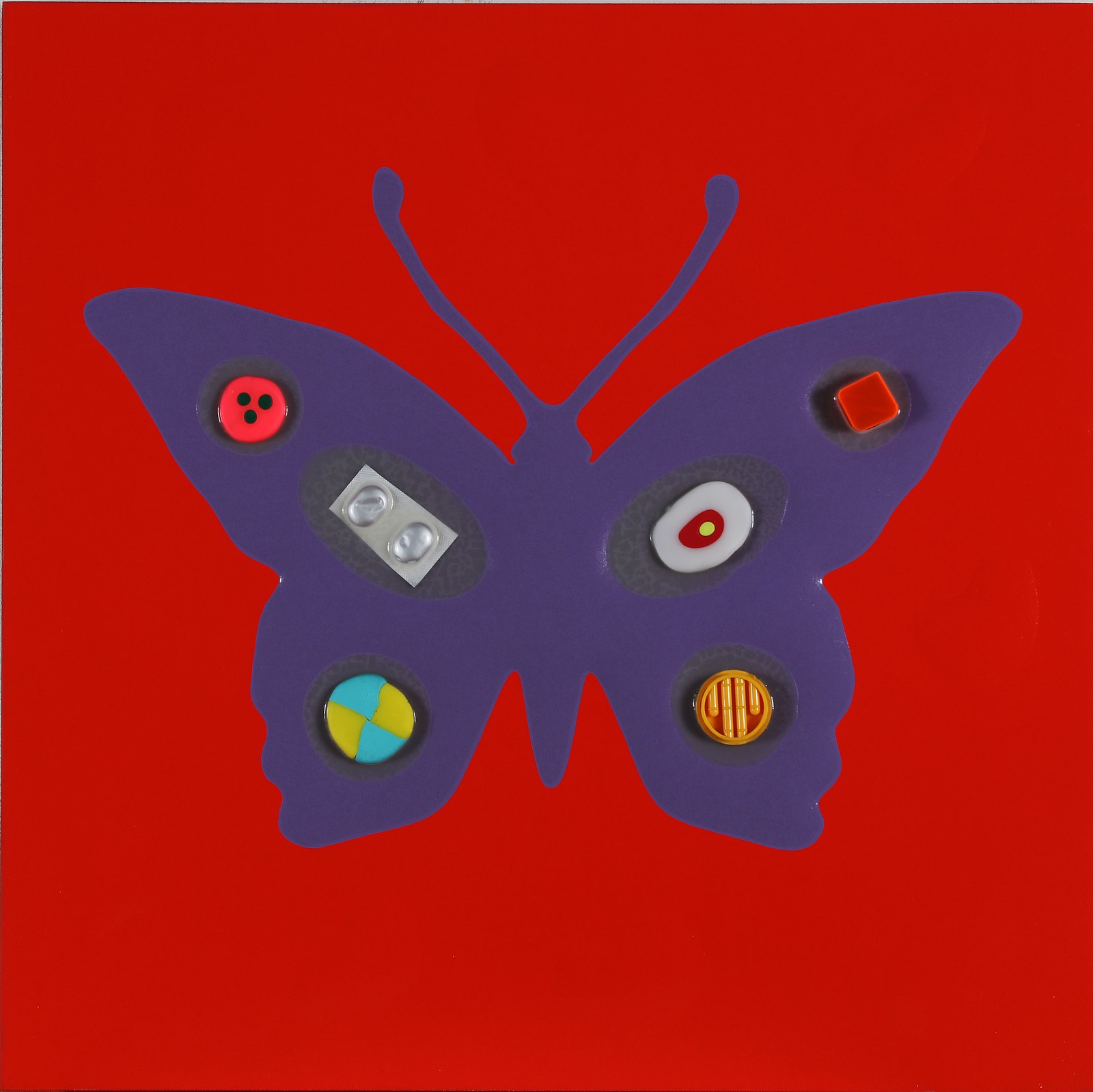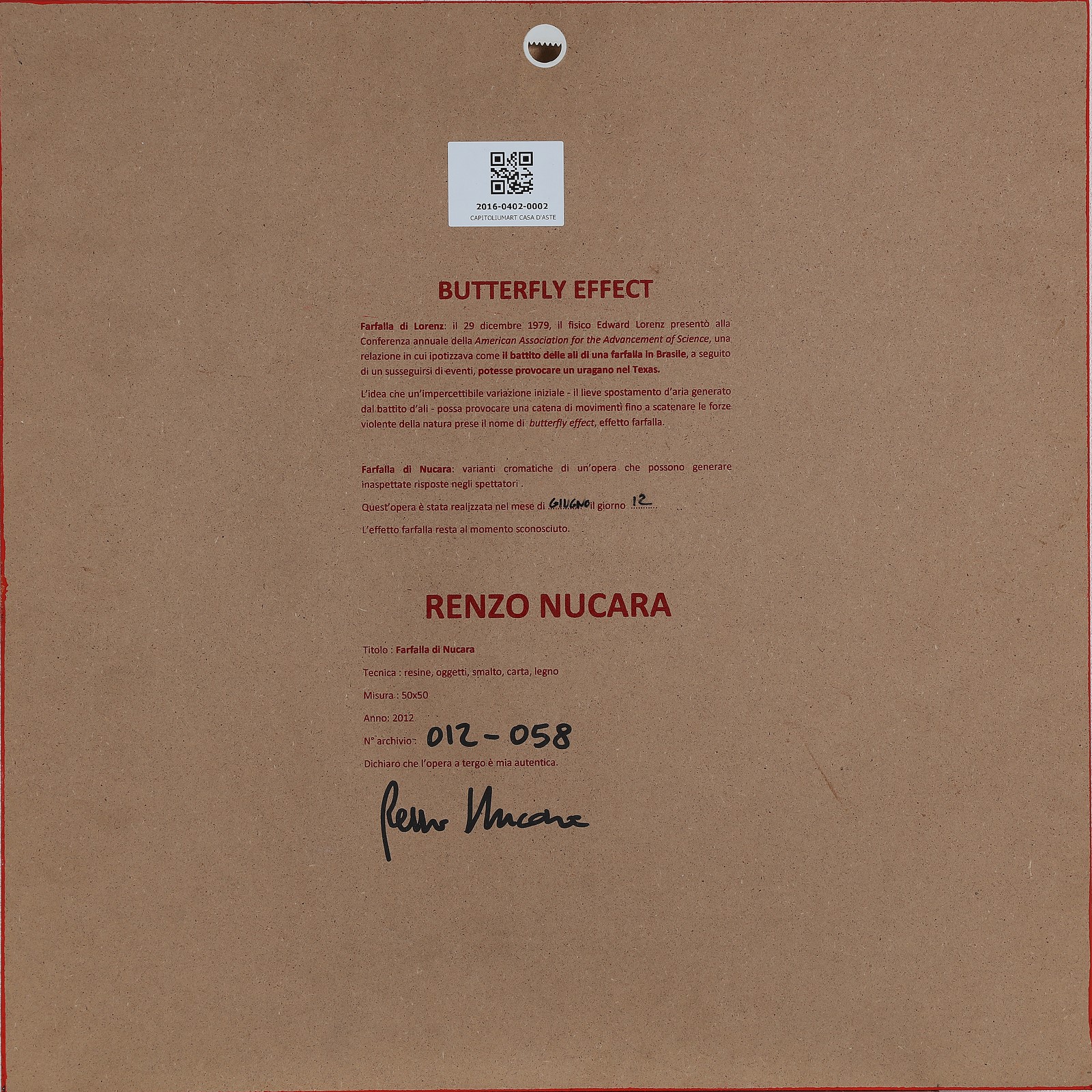 NUCARA RENZO (n. 1955) Butterflay effect. 2012. Tecnica mista su tavola. Cm 50,00 x 50,00. Al retro firma, titolo e anno.Autentica dell'artista su fotografia riportante il relativo numero d'inventario. Opera contenuta in una teca di plexiglass.