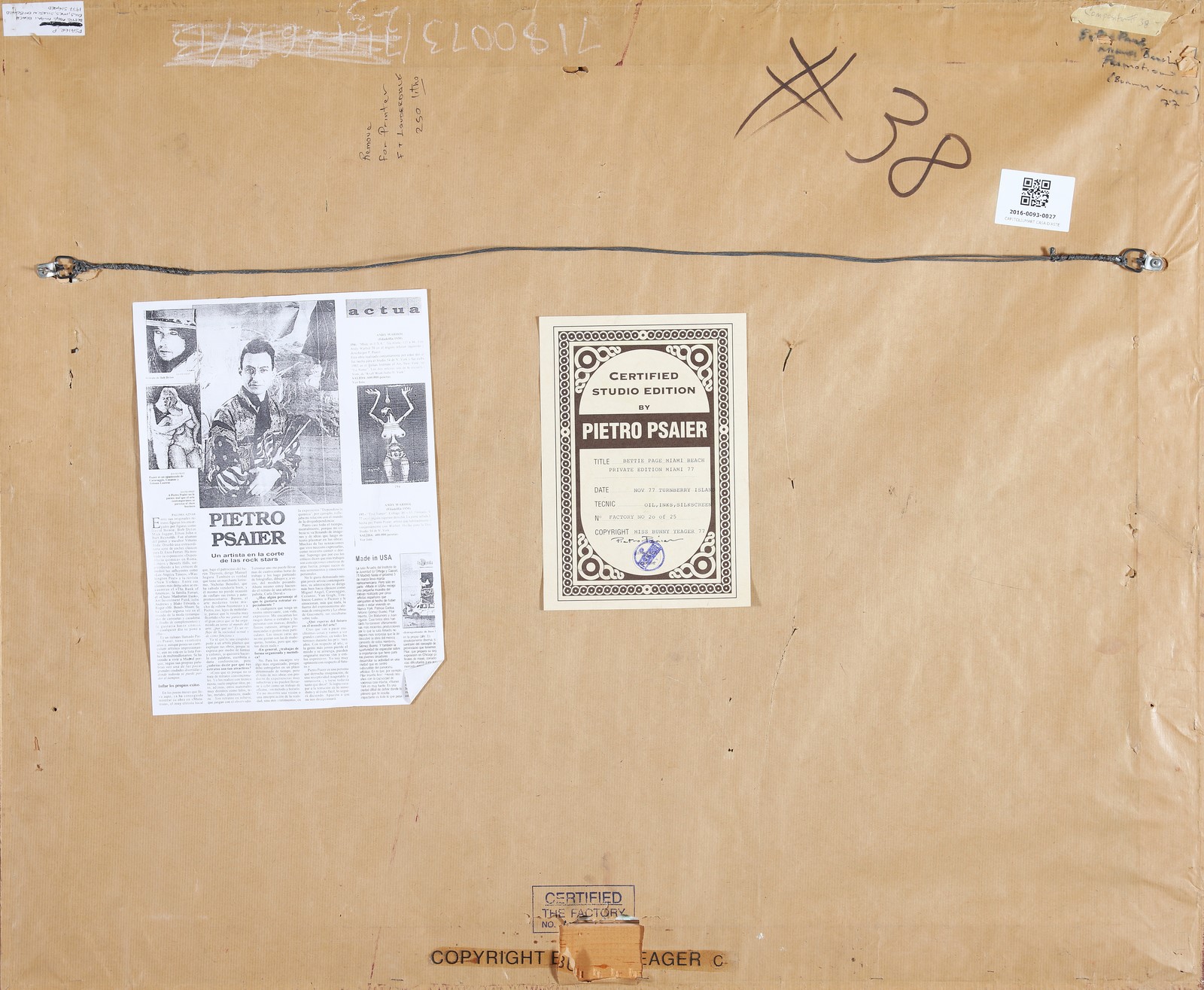 PSAIER PIETRO (1939 - 2004) Betty Page Miami Beach. Tecnica mista su cartone telato. Cm 73,00 x 59,00. Firma e anno in basso a sinistra. Al retro certificato di garanzia firmato e timbrato dall'artista. . Cornice presente