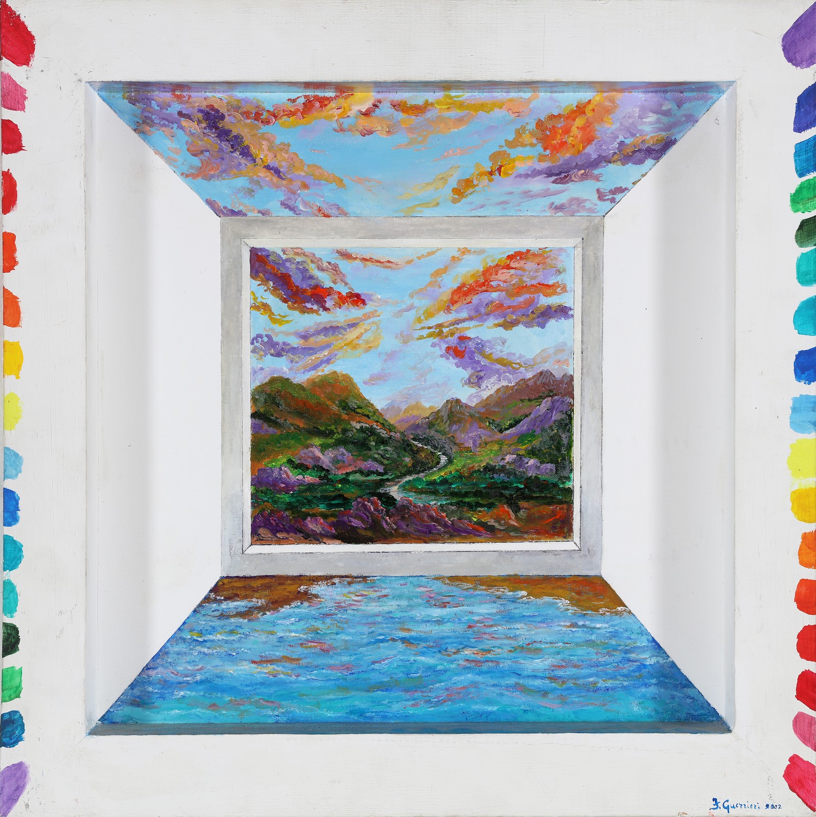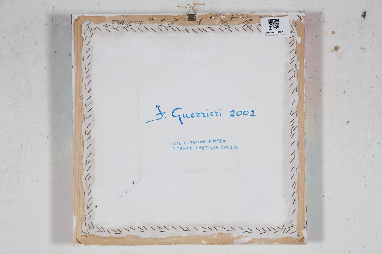 GUERRIERI FRANCESCO (n. 1931) Cielo - terra - mare interno d'artista. 2002. Olio su tela e tavola. Cm 45,00 x 45,00. Firma e anno in basso a destra. Al retro firma, titolo e anno. Autentica dell'artista su fotografia. Cornice presente