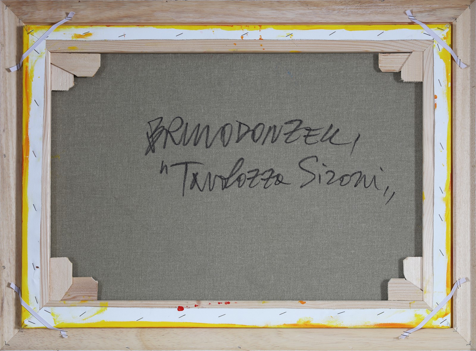 DONZELLI BRUNO (n. 1941) Tavolozza Sironi. Tecnica mista su tela. Cm 70,00 x 50,00. Firma in basso a destra. Al retro titolo e firma. Autentica dell'artista su fotografia. Cornice presente