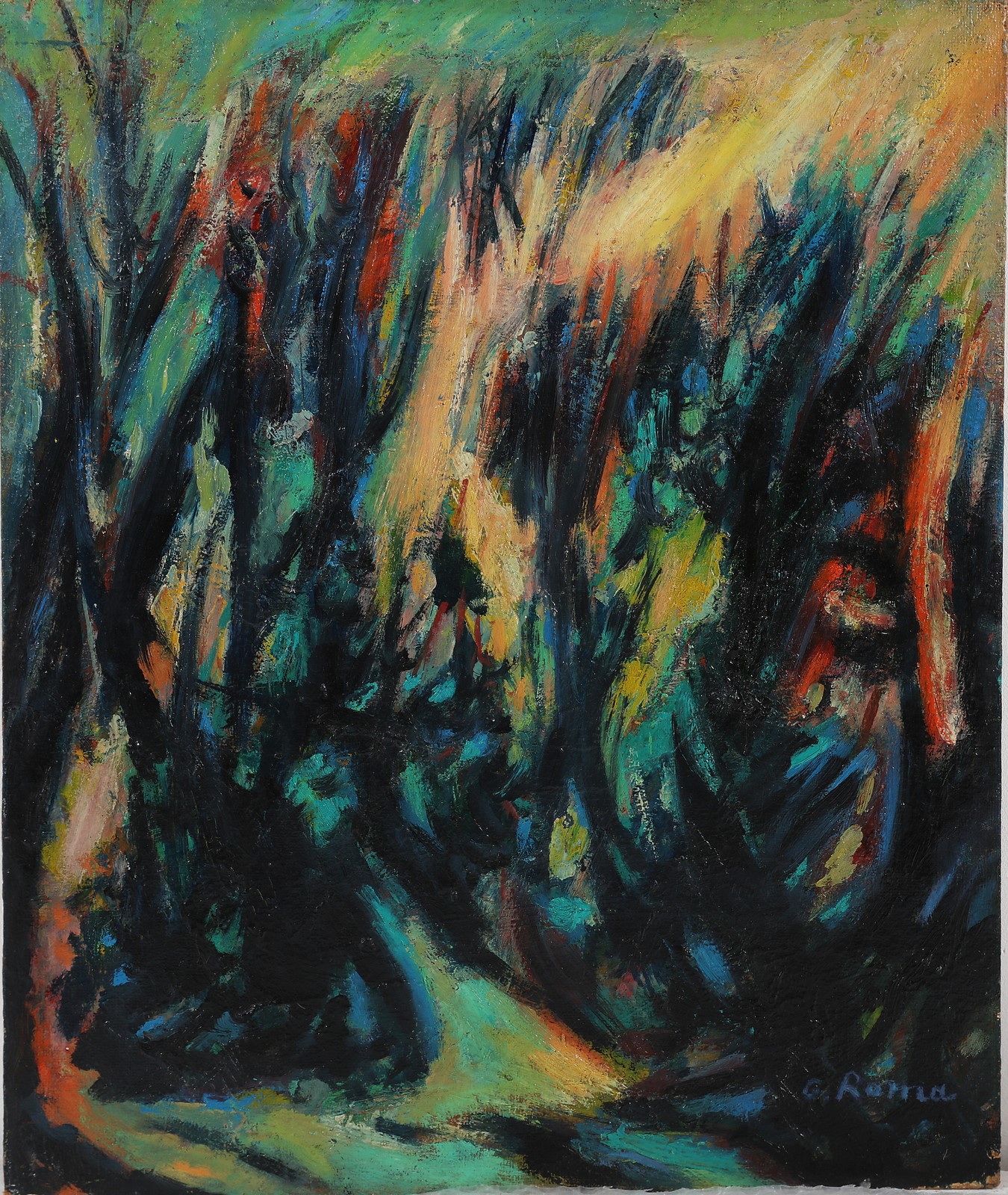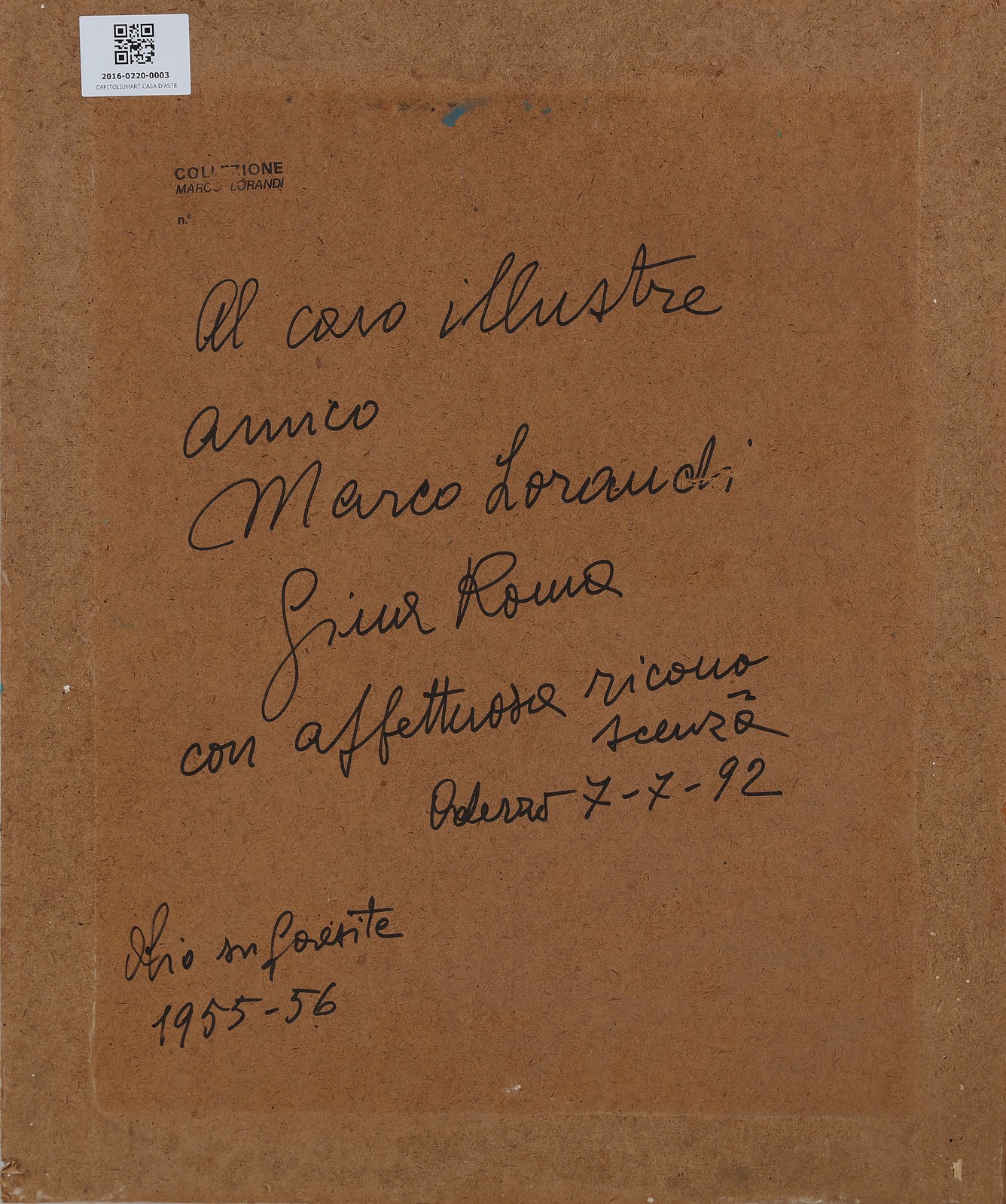 ROMA GINA (1914 - 2005) Senza titolo. . 1955. Olio su faesite. Cm 50,00 x 60,00. Firma in basso a destra. Al retro firma, anno e dedica a Marco Lorandi.