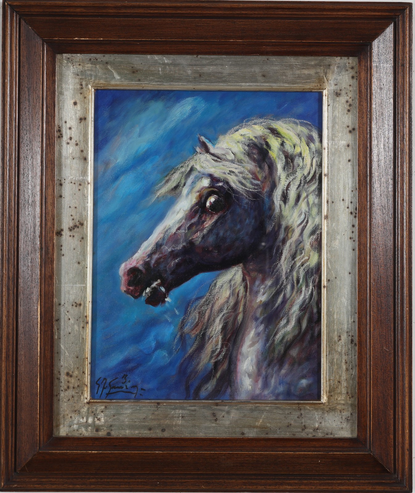 GONZAGA GIOVAN FRANCESCO (1921 - 2007) Testa di cavallo. Olio su tela . Cm 28,00 x 37,00. Firma in basso a sinistra. Al retro titolo, firma e dedica. Cornice presente