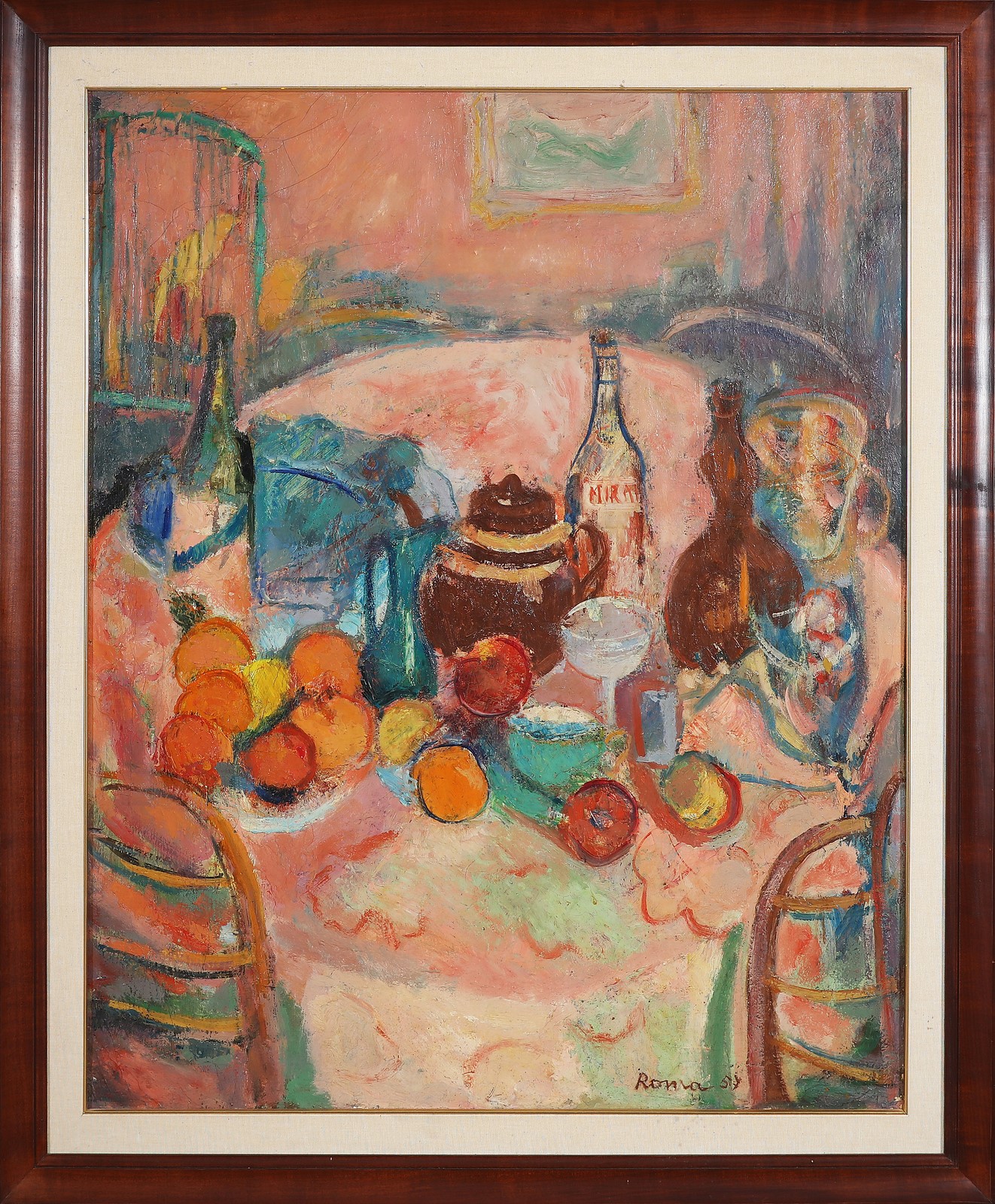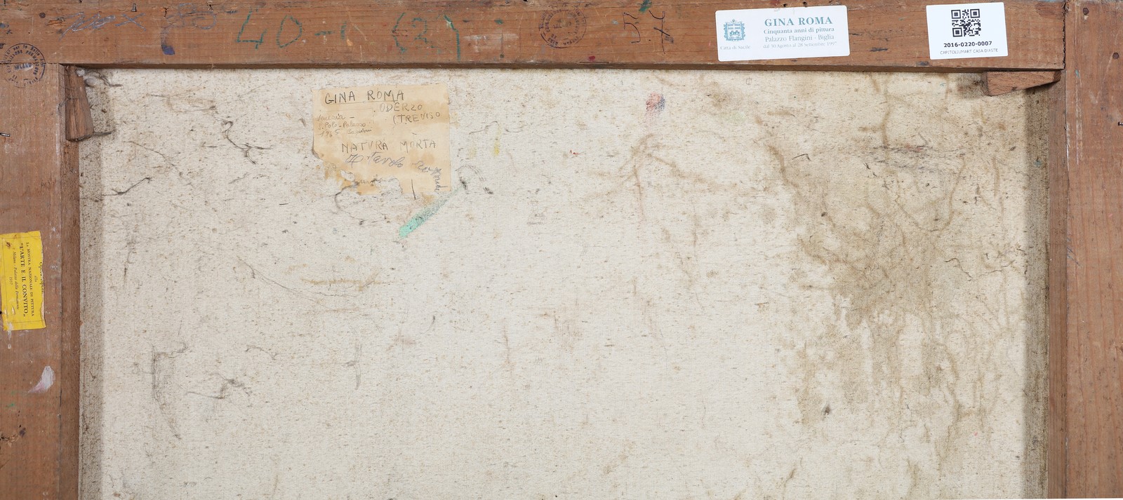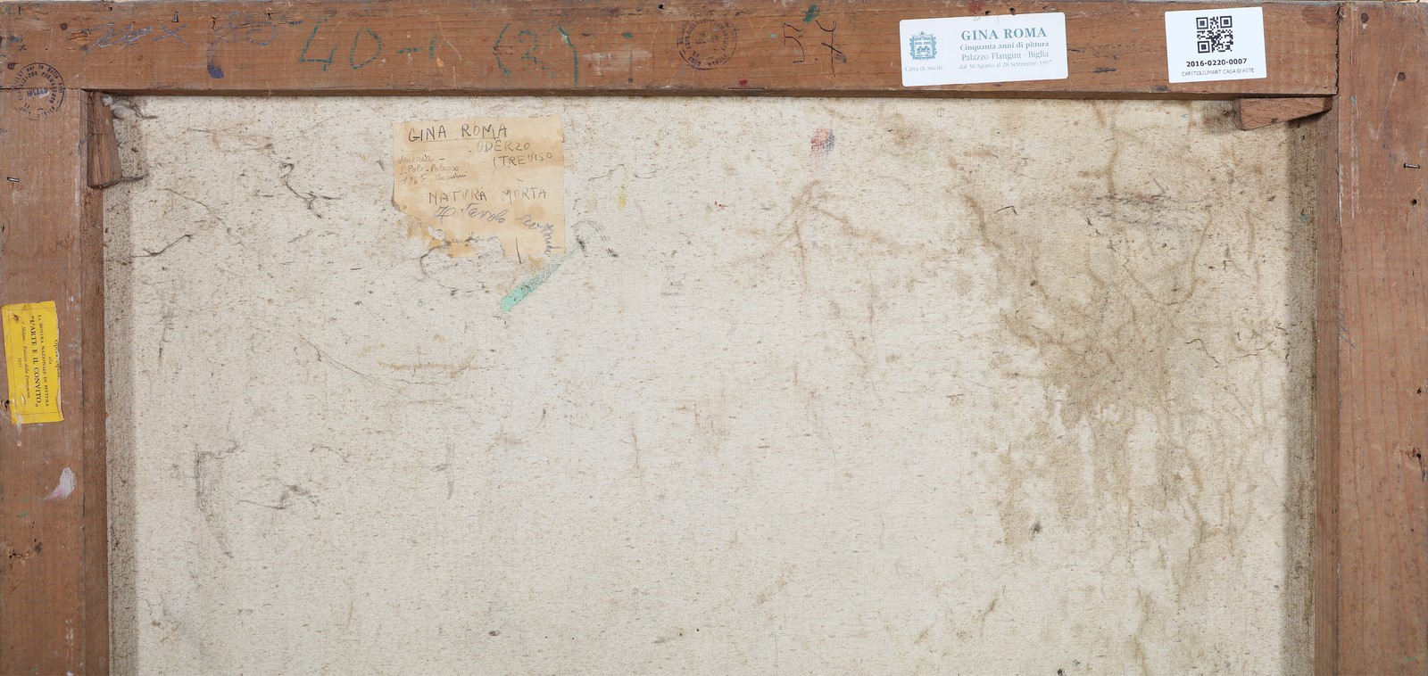 ROMA GINA (1914 - 2005) Natura morta, il tavolo rotondo. . Olio su tela. Cm 80,00 x 100,00. Firma e anno in basso a destra. Al retro cartiglio di provenienza a cura del Palazzo Flangini-Biglia, Sacile. Cartiglio Palazzo della Permanente, Milano. . Cornice presente