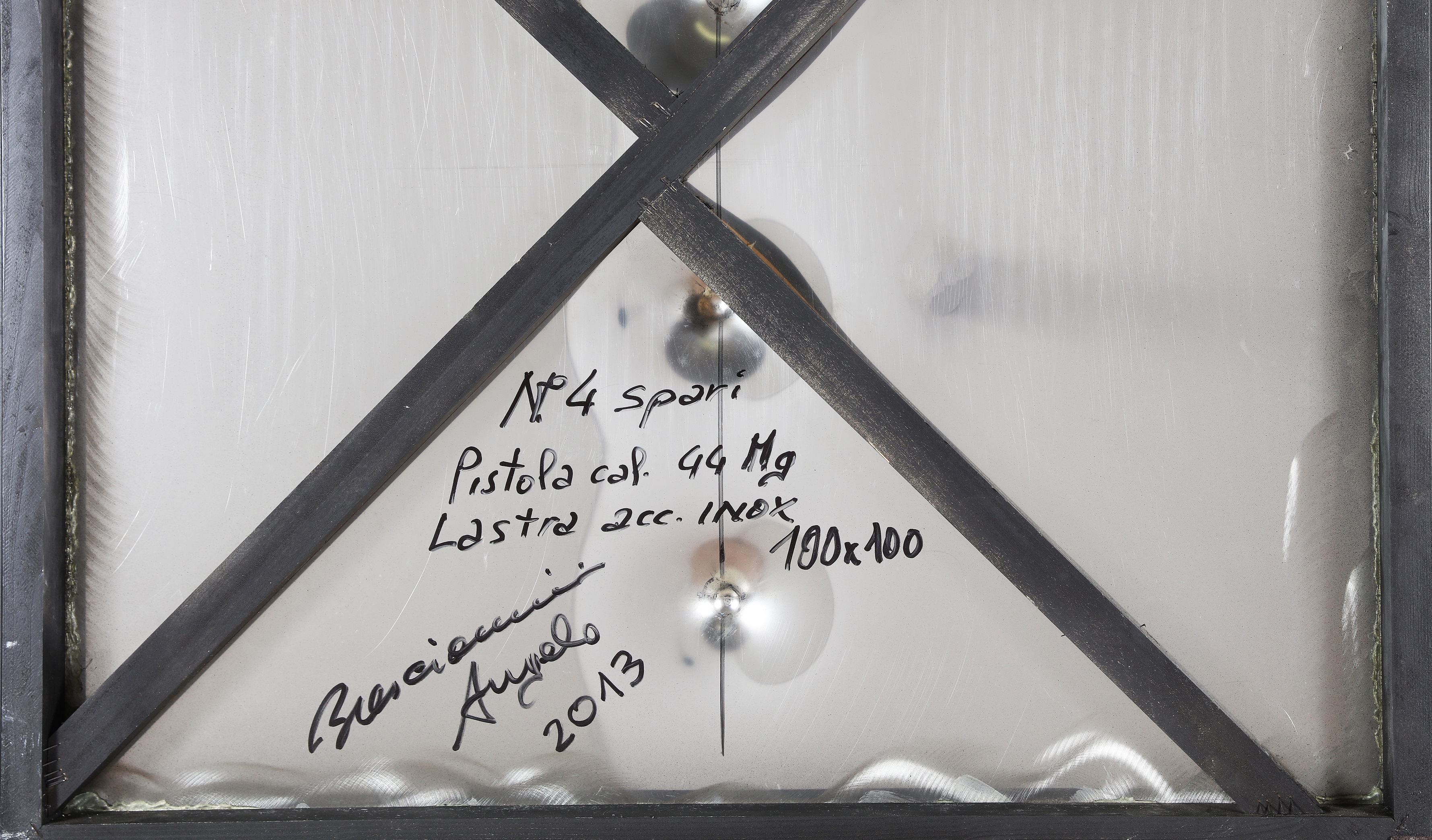 BRESCIANINI ANGELO (n. 1948) 4 spari di pistola calibro 44 Mg. 2013. Intervento su lamiera. Cm 100,00 x 100,00. Al retro titolo, firma e anno. Autentica dell'artista su fotografia.