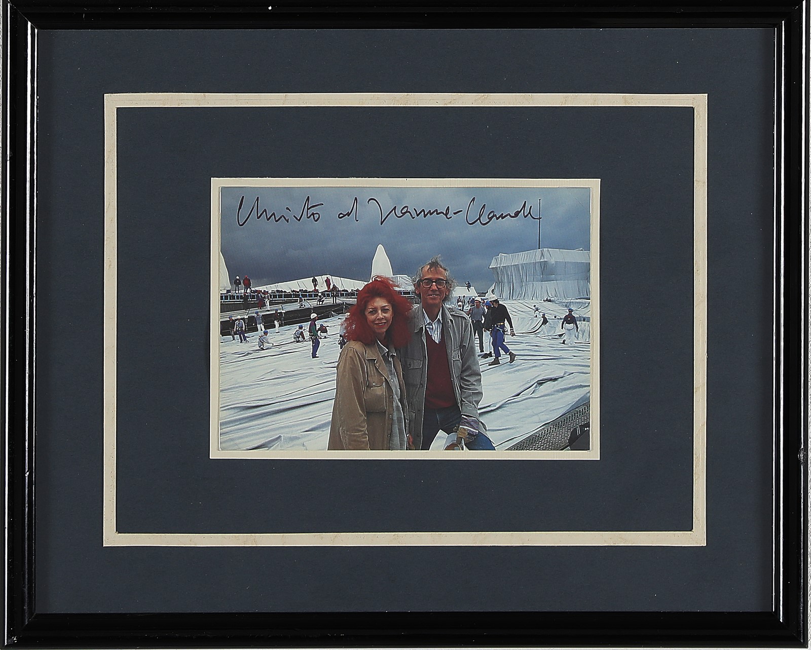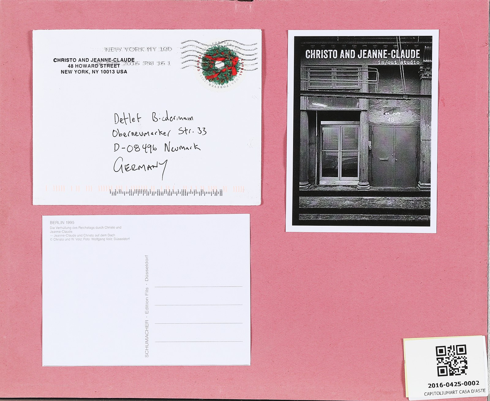 CHRISTO' (n. 1935) & JEANNE-CLAUDE (1935 - 2009) Die Verhullung des Reichstags durch Christo und Jeanne-Claude. 1995. Postcard. Cm 15,00 x 11,00. Firma in alto al centro. Al retro timbro a cura dello studio di Christo e Jeanne-Claude di New York. Cornice presente