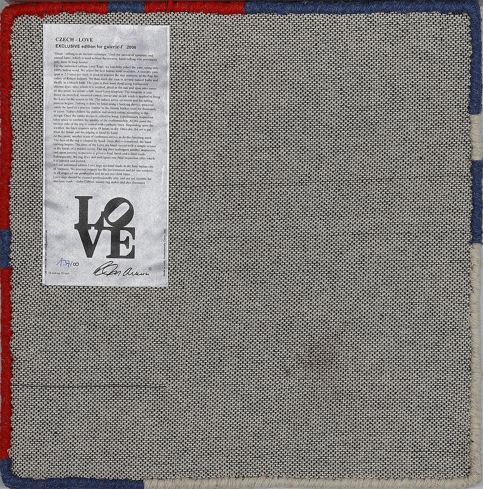 INDIANA ROBERT (n. 1928) LOVE. Tappeto. Cm 38,50 x 38,50. Ed.137. Edizione esclusiva per la Galerie - F 2006. Al retro cartiglio descrittivo.