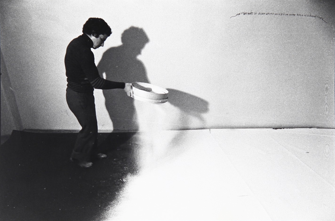 MELOTTI GIANNI (-) Marco Del Re...di come sbarcare il lunario 1975 stampa alla gelatina sali d'argento - vintage 23,5x30 cm sul retro timbro del fotografo sulla parete scritta di Alighiero Boetti