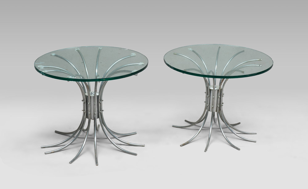 COPPIA DI TAVOLINI DA SALOTTO, ANNI '60 in metallo e vetro, con piano...