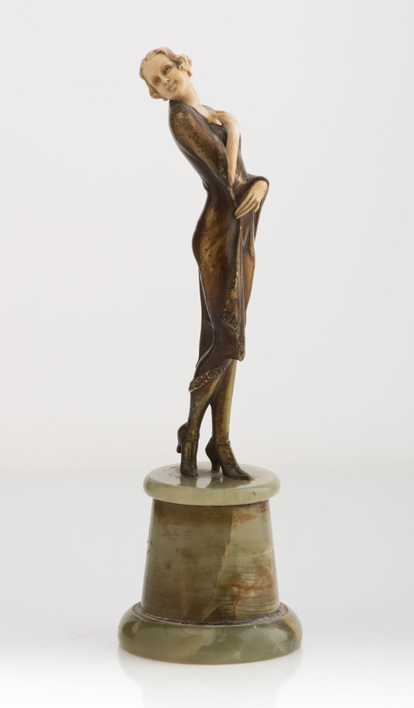 Statuina di giovane donna in marmo, bronzo e avorio.