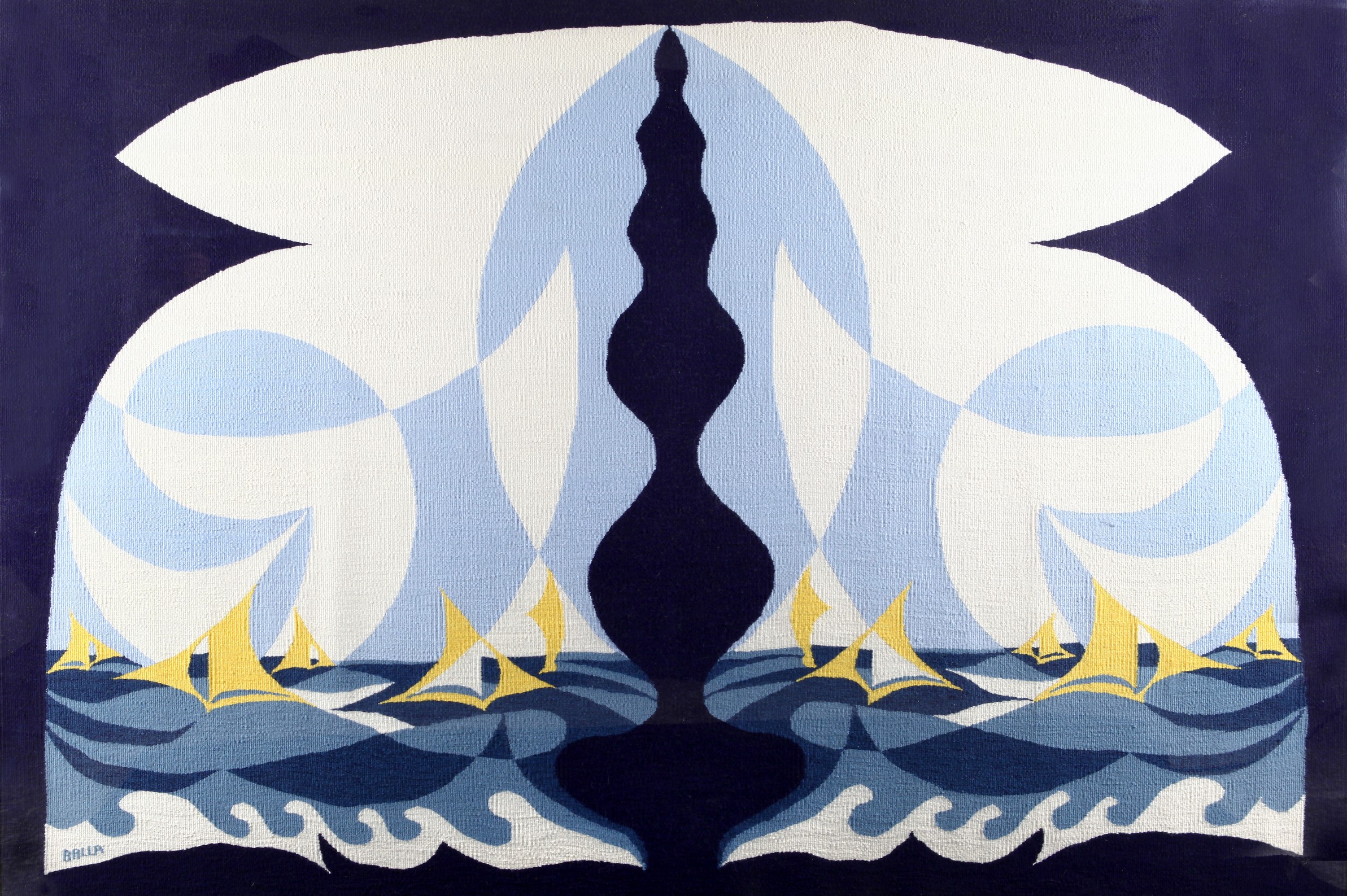 GIACOMO BALLA (1871-1958) Linee di forza di mare arazzo esemplare 6/15 cm 138x190 firmato in basso a destra eseguito dalla arazzeria Pennese sul retro etichetta Coen e Pieroni Pescara opera pubblicata su catalogo e sul manifesto della mostra tenutasi al museo casa natale di Gabriele D'annunz...