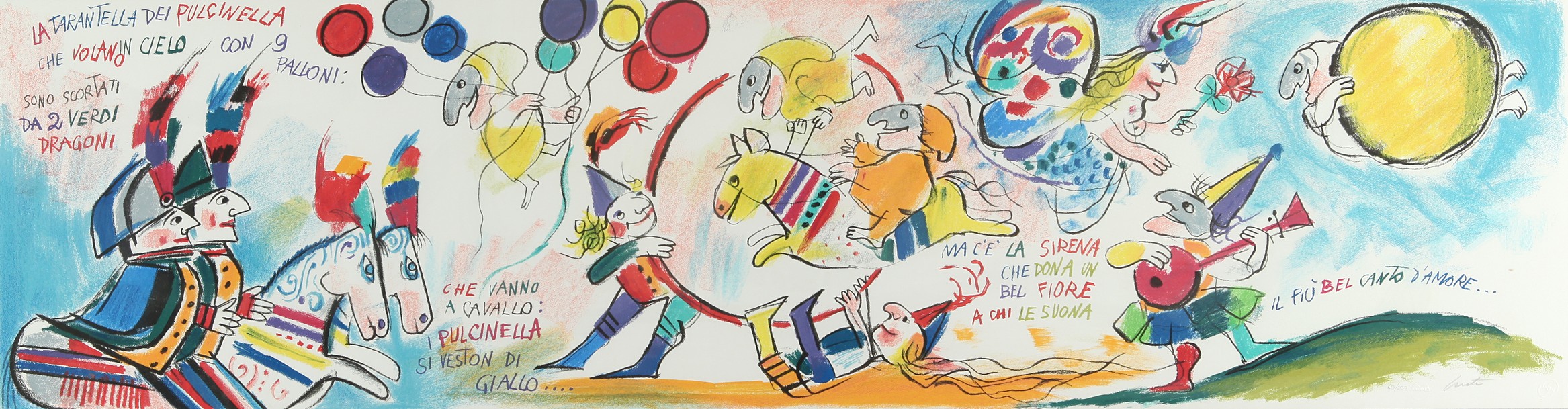 LUZZATI (-) La tarantella 1993 serigrafia esemplare 60/200 cm 40x150 firmato in basso a destra etichetta galleria Vicolo Genova sul retro