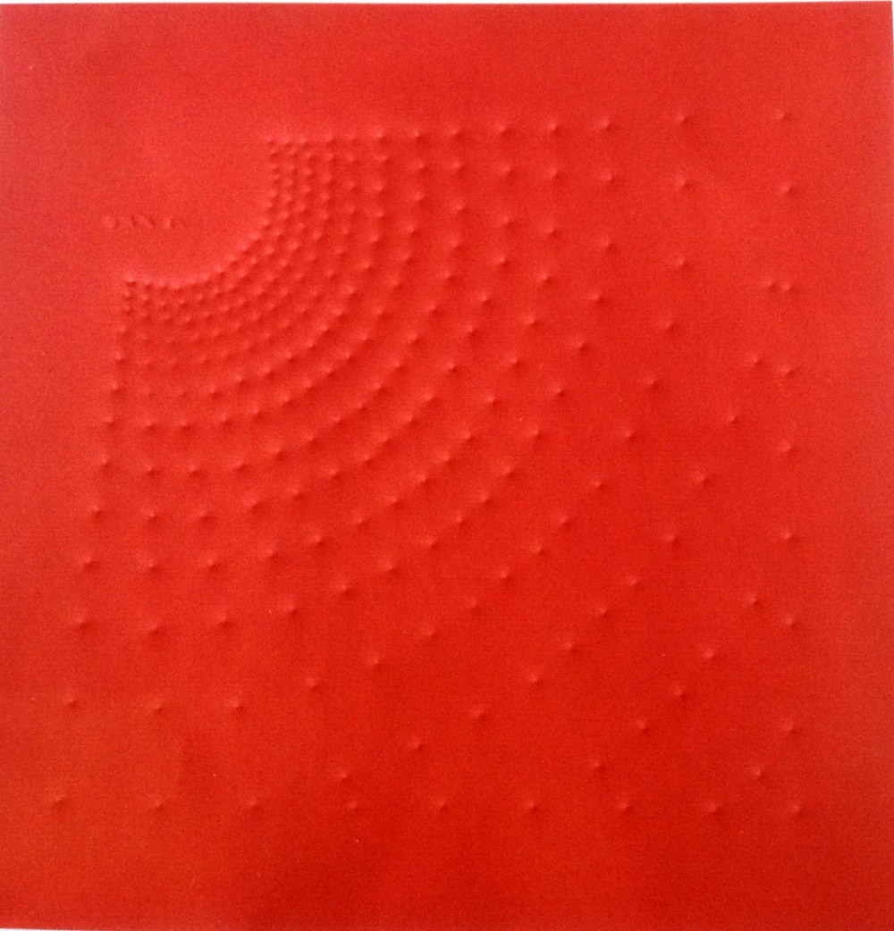 Angelo Brescianini "Spari di pistola su lamiera rossa" - Spari su lamiera verniciata di rosso cm 100x100 - Autentica e archivio dell'artista e dello Studio Lattuada su foto - Opera pubblicata sul Catalogo Ragionato delle opere di Angelo Brescianini "A ferro e fuoco" e " A singolar tenzone"
