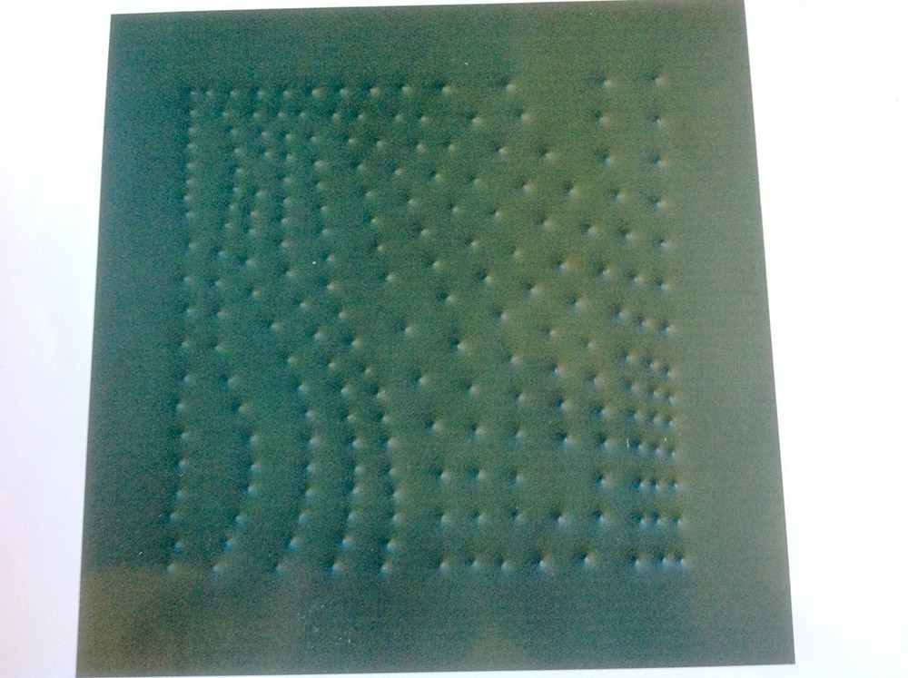 Angelo Brescianini "spari di pistola su lamiera verde cm 100x100 - Autentica e archivio dell'artista e dello Studio Lattuada su foto - Opera pubblicata sul Catalogo Ragionato delle opere di Angelo Brescianini "A ferro e fuoco" e " A singolar tenzone"