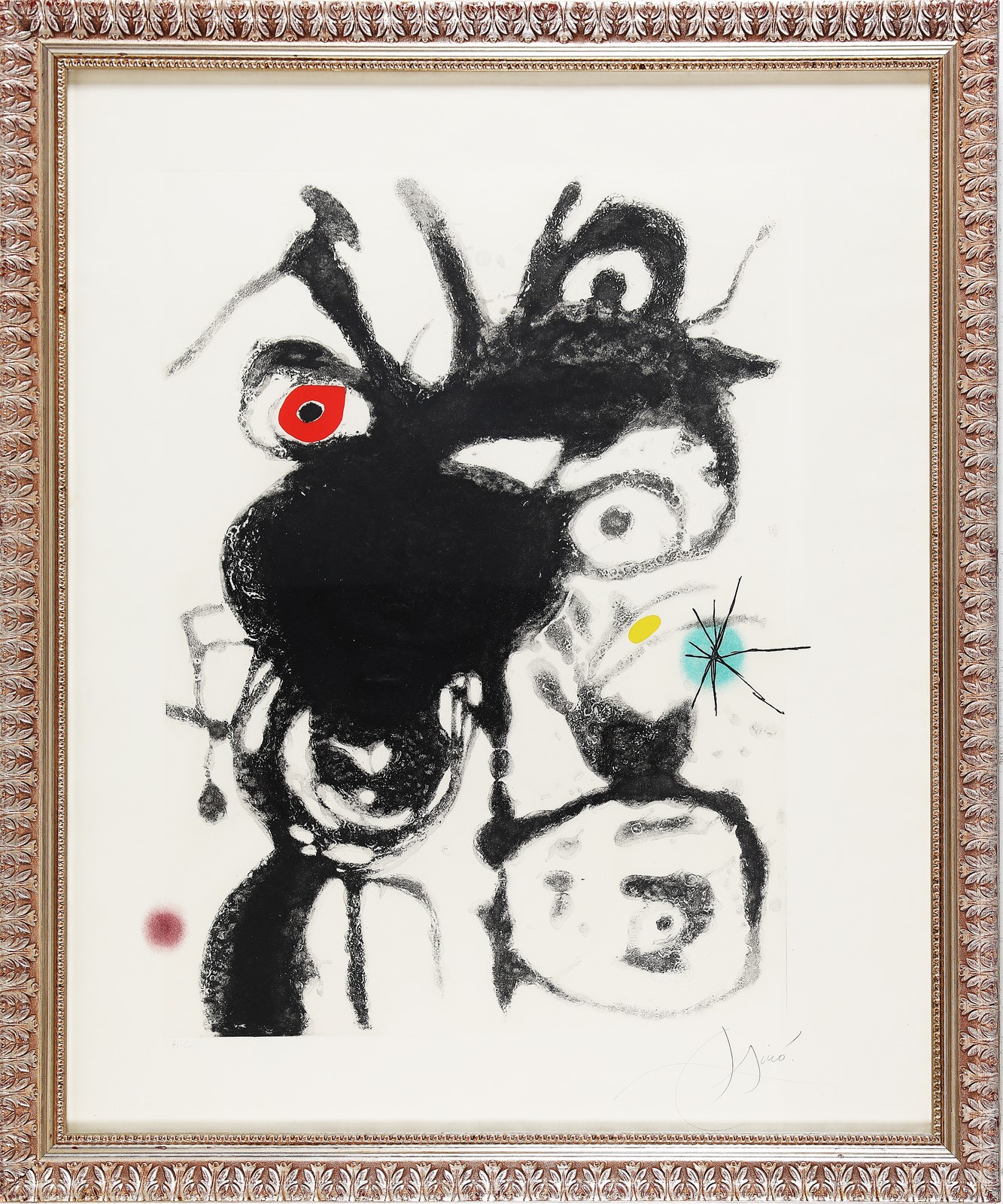 MIRO' JOAN (1893 - 1983) Espriu Miro. 1975. Acquaforte, acquatinta, carborundum. Cm 69,50 x 86,50. H.C. Tiratura e firma in basso a matita. Dimensioni lastra: cm 70x50. In basso a sinistra timbro a secco Sala Gasbar. Quinta tavola da: Espriu- Mirò. 1975. Poesie di Salvador Espriu e tavole di Joan Mirò. Sala Gaspar Editore, Barcellona 1975. Stampatore F.F.Torralba, Rubi (Barcellona). Tiratura a 50 esemplari numerati e alcune prove fuori commercio stampate su carta "Guarro" con filigrana "Sala Gaspar". DUPIN III, 872. Cornice presente