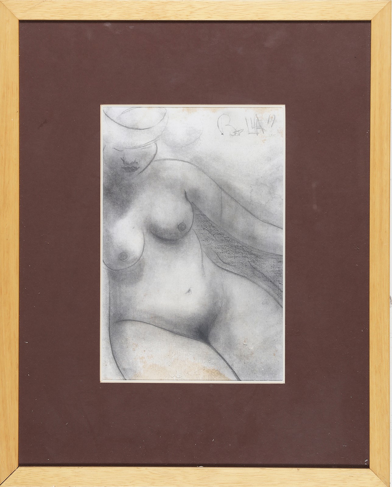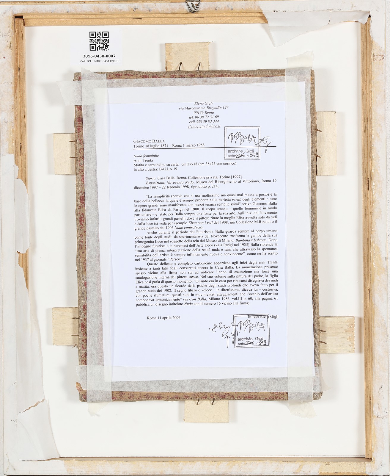 BALLA GIACOMO (1871 - 1958) Female nude. 1930. Pencil and charcoal on paper. Cm 18,00 x 27,00. Signed and dated higher right. Provenance: Casa Balla, Rome; private collection, Turin. Exhibition: Novecento Nudo, Museo del Risorgimento al Vittoriano, Rome, 1997 December, 19th - 1998, February 22nd. Elena Gigli, Rome, Authenticity certificate on photo. Cornice presente