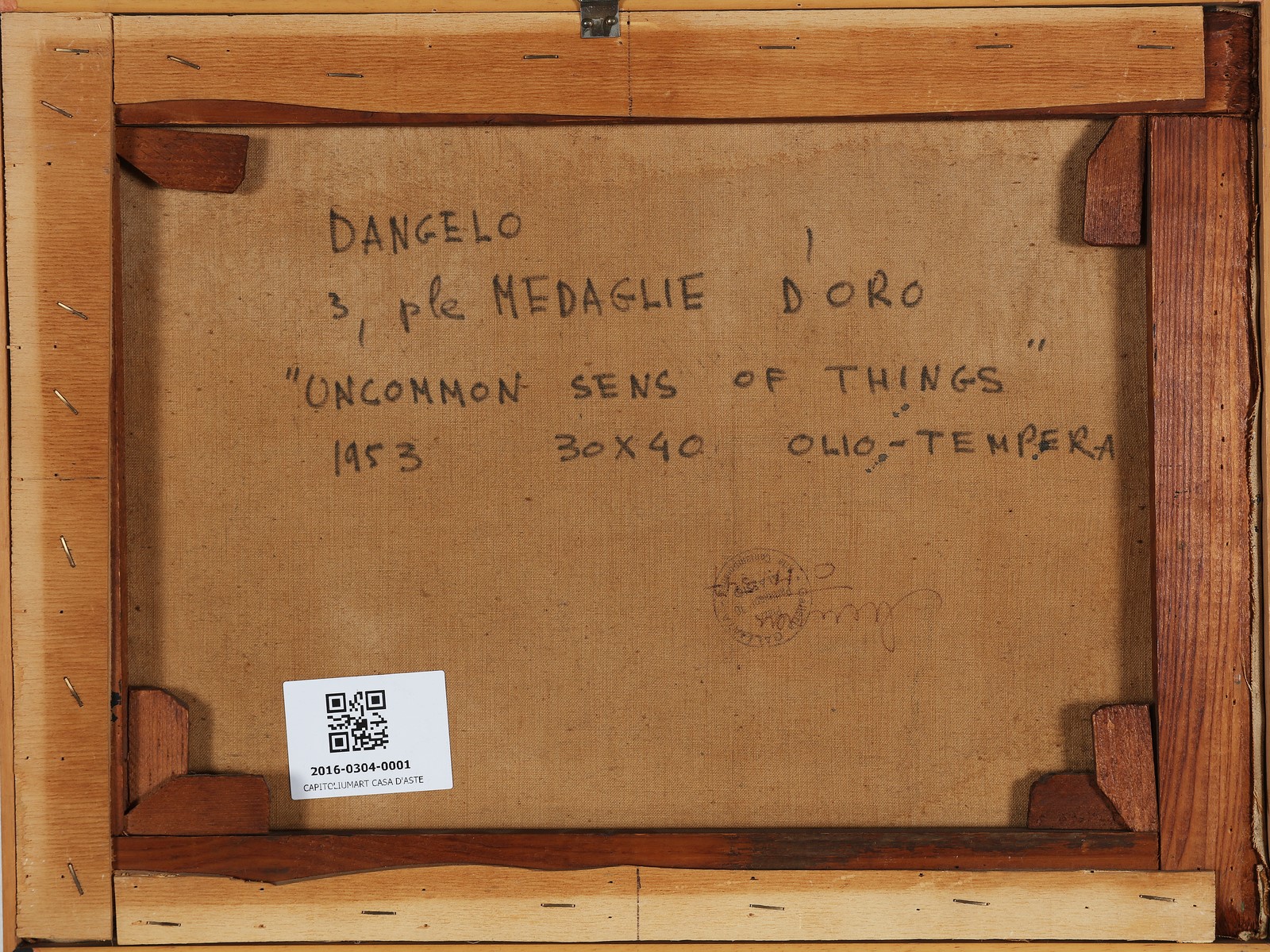 DANGELO SERGIO (n. 1932) Uncommon sens of things. 1953. Olio e tempera su tela. Cm 40,00 x 30,00. Al retro titolo, firma e anno.