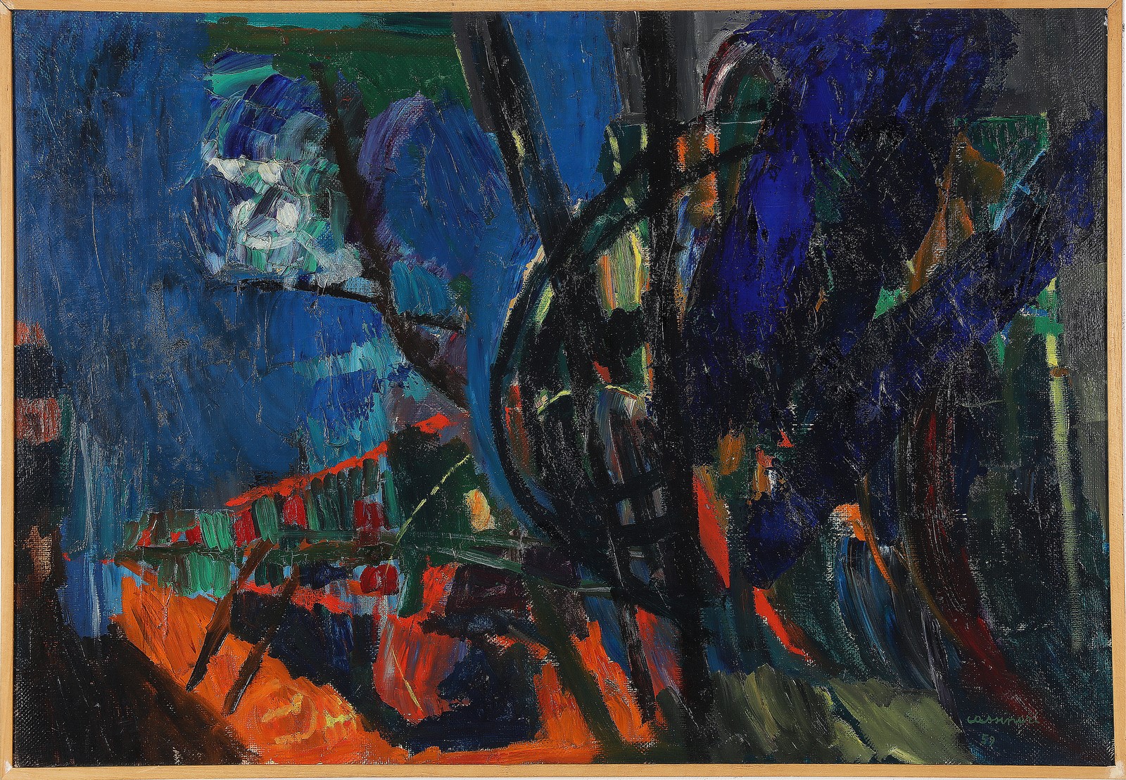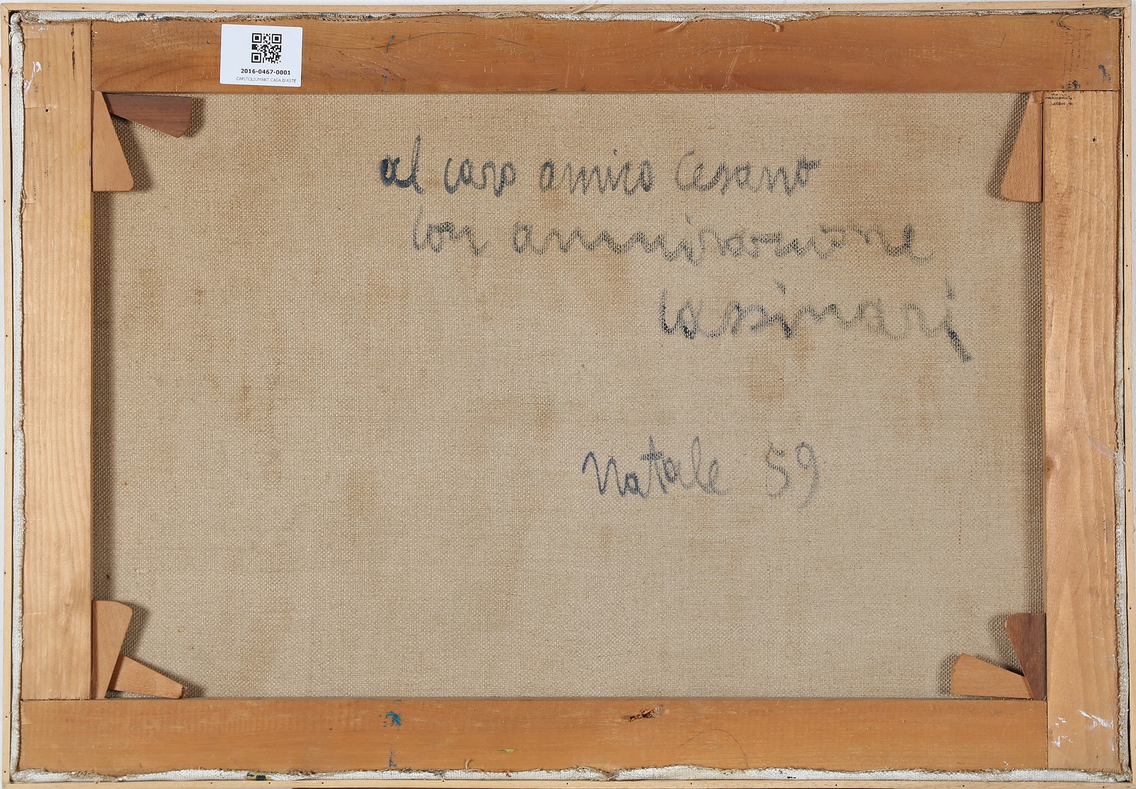 CASSINARI BRUNO (1912 - 1992) Senza titolo. 1959. Olio su tela. Cm 73,00 x 50,00. Firma e anno in basso a destra. Al retro firma, anno e dedica. Cornice presente