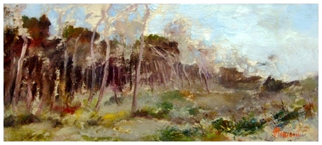 ALVARO MARIONI Fauglia 1911 – Fauglia 1999 Pini a Cecina Marina 1975 Olio su tavola 9,5 x 20. Firma in b. a d.; sul verso firme, data e titolo + timbro e num. archivio Collezione Alvaro Marioni, anno 1999 + etichetta Museo Alvaro Marioni, Fauglia.B.A.: 100
