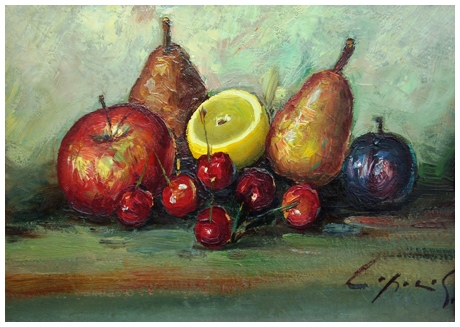 GIO BATTA LEPORI Livorno 1911 – Livorno 2002 Frutta Olio su faesite 23 x 32. Firma in b. a d.; sul verso etichetta studio dell’artista + firma e titolo. B.A.: 70