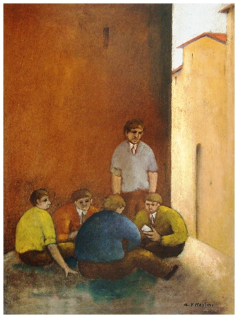 GIAN FRANCO MARTINI Primi giochi Olio su cartone 40 x 30. Firma in b. a d.;...