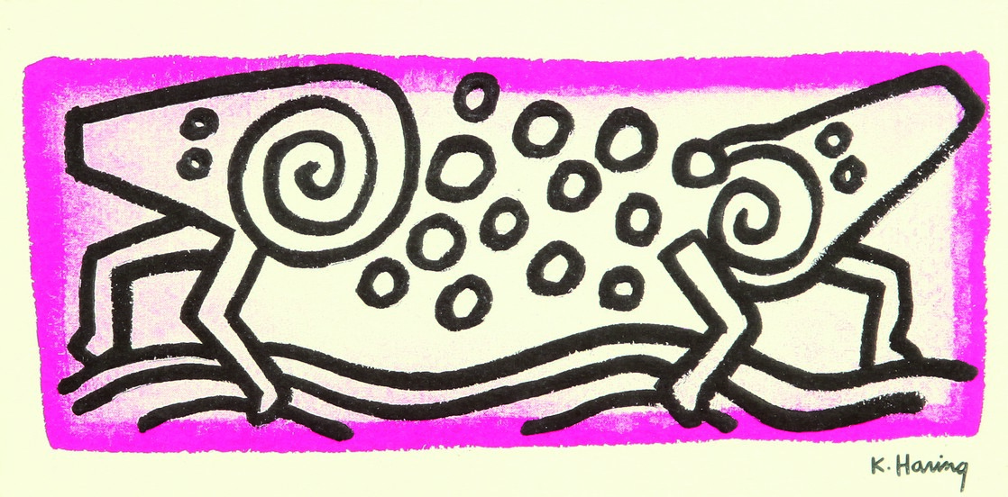 KEITH HARING (1958-1990) Wine label tempera su carta cm. 8,5x17 firmato in basso a destra lettera dell'archivio che lo classifica come "collectibles"