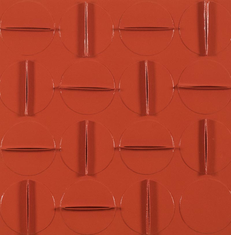 Walter Fusi Senza titolo 1968 Tecnica mista e rilievi su tavola, cm. 40x40x4 Firma e data sul lato destro Sul verso: firma e n.° 32/68.