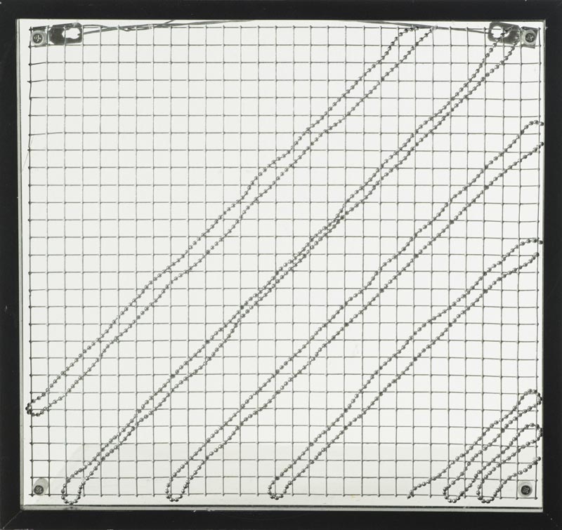 Manfredo Massironi Senza titolo 1961 Assemblaggio di rete di ferro, catenelle di metallo e plexiglas, cm. 39x41 Firmato sul lato destro. Autentica di Franca Massironi su Certificato di Autenticità Galleria d'Arte Orler, Favaro Veneto.