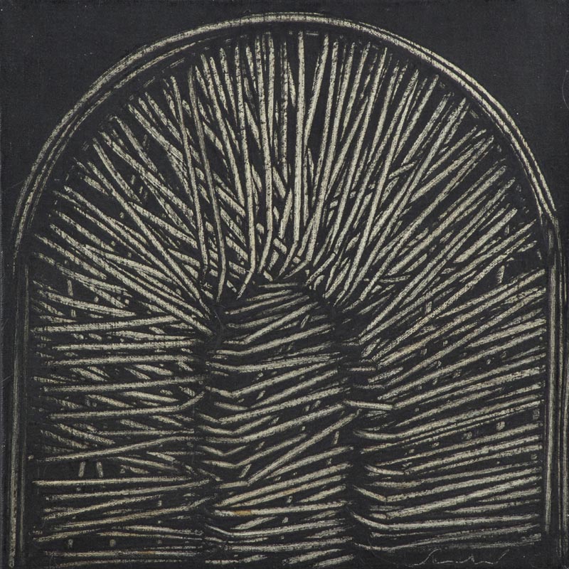 Emilio Scanavino Senza titolo Olio su tela applicata su tavola, cm. 30x30 Firmato in basso a destra; Sul verso: firma e scritto di Provenienza.