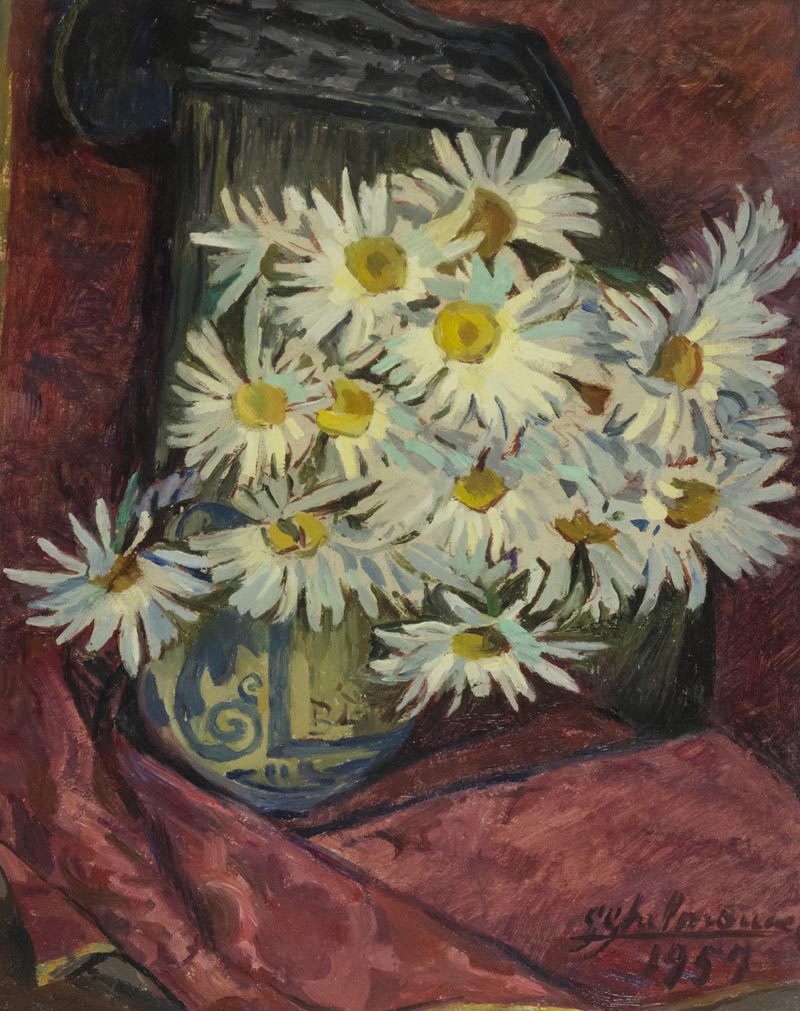 Giulio Ghelarducci La margherita e la cetra 1957 Olio su cartone, cm. 50x40 Firma e data in basso a destra; Sul verso: firma, data e titolo.