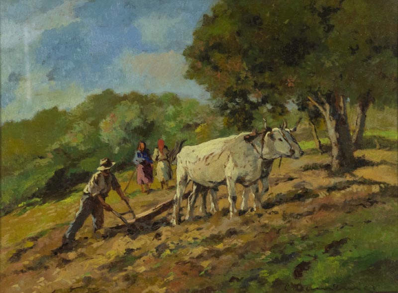 Carlo Domenici Buoi all'aratro Olio su tavola, cm. 54x71 Firmato in basso a destra; Timbro "Alberto Mainardi", Livorno