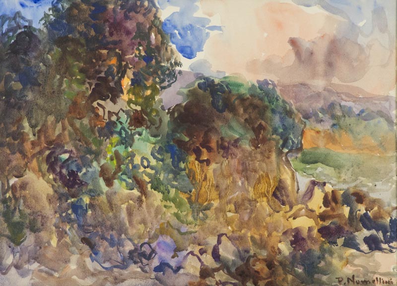 Plinio Nomellini Paesaggio Elbano Acquerello su carta riportata su tela, cm. 38x51,5 Firmato in basso a destra; Sul verso: Sigla Bruno Girardi. Autentica di Eleonora Barbara Nomellini, su foto.
