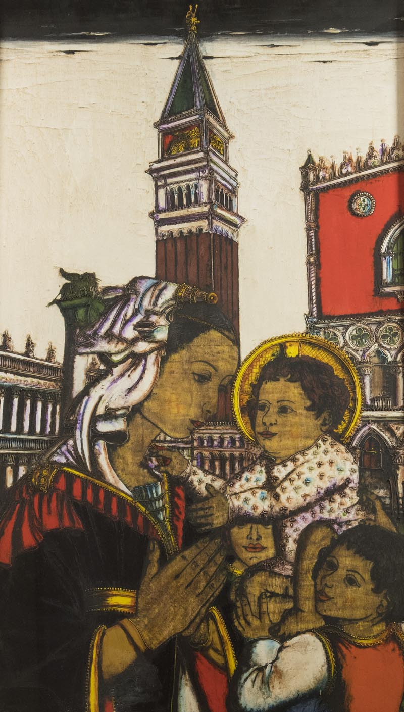 Gennaro Picinni Madonna con bambino a Venezia 1971 Olio su tavola, cm. 138,5x81 Firma e data in basso a destra; Timbro: "Galleria Russo e Russo Barcaccia", Roma.