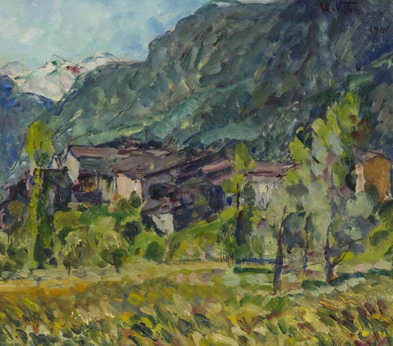 Umberto Vittorini Mattino a Dolonne 1941 Olio su tavola, cm. 35x40 Firma e data in basso a destra; Sul verso: Etichetta con firma, data e titolo.