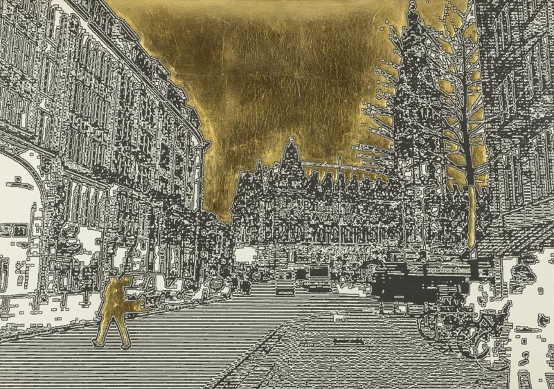 Leonida De Filippi Paesaggio urbano Inchiostro e foglia oro su cartoncino cm. 66x93 Sul verso: firma, data e titolo.