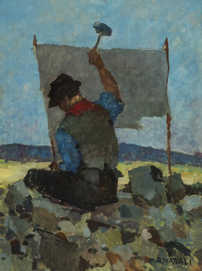 Renato Natali Spaccapietre Olio su masonite, cm. 60x45 Firmato in basso a destra; Sul verso: firma e titolo. Timbro: "Galleria d'Arte Athena", Livorno. Etichetta "Raccolta Ugo Ughi", Livorno, con timbri e descrizione.