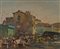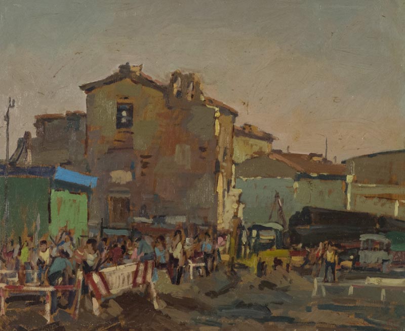 Masaniello Luschi Mercato 1969 Olio su tela, cm. 50x60 Firma in basso a destra; Sul verso: firma e data; Timbri: "Saletta Michon", Livorno.