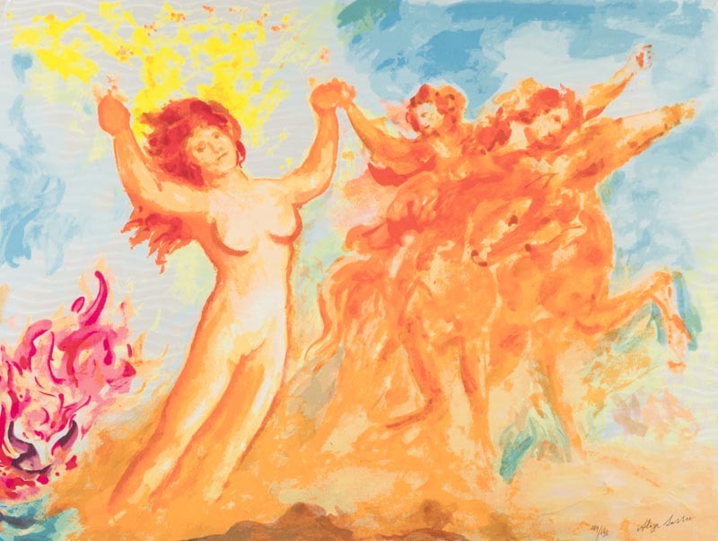 Aligi Sassu Senza titolo Serigrafia su cartoncino applicato su tavola, cm. 70x91,5, es. 189/198 Firma e tiratura in basso a destra; Sul verso: Timbro Sanzanobi. La carta presenta lievi imperfezioni agli angoli.
