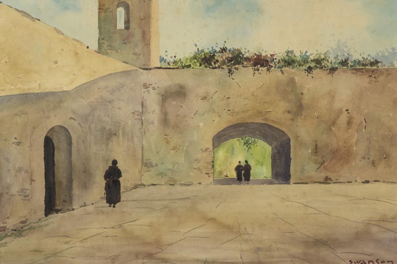 Swanson Cortile Acquerello su cartoncino, cm. 36,5x55 Firmato in basso a destra.