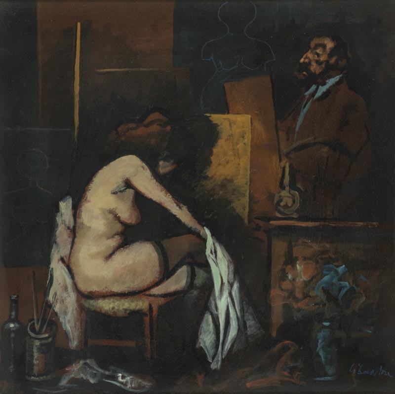 Fausto Maria Liberatore Modella e pittore Olio su tela, cm. 50X50 Firmato in basso a destra.