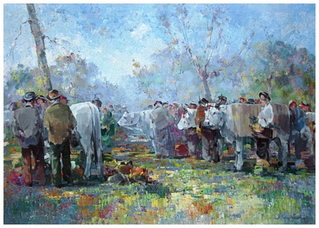 GIULIO DA VICCHIO Vicchio di Mugello 1925 – Livorno 2004 Mercato di bestiame, autunno in Mugello 1967 Olio su tela 70 x 100. Firma in b. a d.; sul verso titolo, località e firma. B.A.: 2.500