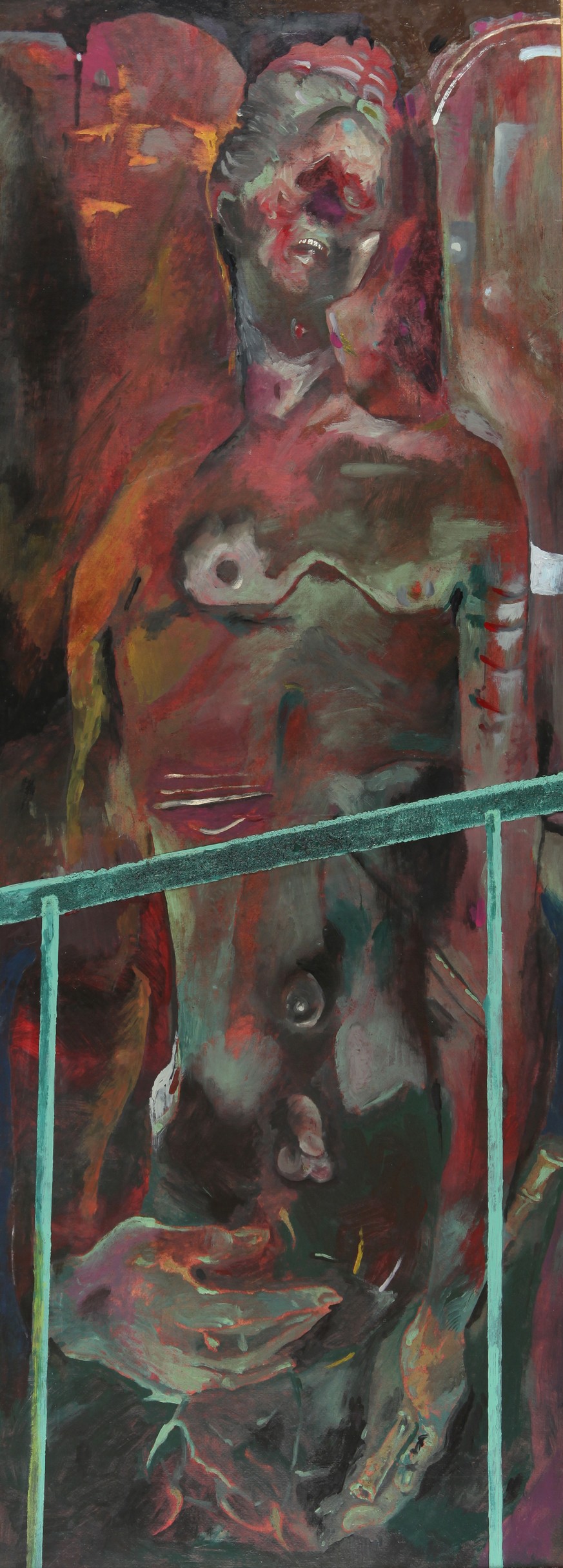 GIANNETTO FIESCHI (1921-) Ecce homo 1984 olio su cartone cm. 132,5x50 firmato e datato sul retro etichetta Galleria Forni (BO) etichetta esposizione promotrice per le arti (GE))