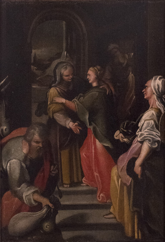 Pittore tosco-romano (da Federico Barocci), Visitazione, fine XVI inizio XVII secolo. Olio su tela, 44 x 30 cm. Databile tra la fine del XVI e l’inizio del XVII secolo e proveniente dal quattrocentesco palazzo Passionei Paciotti a Urbino (oggi sede della Fondazione Bo), il quadretto è una copia della grande pala con la Visitazione di Federico Barocci nella Chiesa Nuova (Santa Maria in Vallicella) a Roma, dipinta nel 1583-1586 e di cui esistono diverse repliche soprattutto sei-settecentesche, tra cui si segnalano quelle nella Galleria nazionale delle Marche a Urbino e nella chiesa dei Girolamini a Napoli.