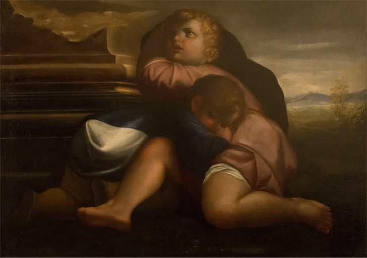 Padovanino, Due putti in un paesaggio con rovine, 1630 ca. Olio su tela, 75 x 105 cm. Come rivela anche un’antica perizia scritta sul retro della tela («Opera originale del Padovanino. Carlo Grimaldi»), l’opera va assegnata ad Alessandro Varotari detto il Padovanino (1588-1649), figlio del pittore e architetto Dario Varotari. Testimone diretto della sua carriera, Carlo Ridolfi racconta nelle Maraviglie dell’arte (Venezia, 1648) che il Padovanino giunse a Venezia nel 1614 e lì trascorse i restanti trentacinque anni della sua vita, eccezion fatta per un soggiorno a Roma, realizzandovi molte pale d’altare «con le quali si è stabilito nel mondo un perpetuo honore» (Ridolfi 1914-1924, vol. II, p. 92). Formatosi nella sua città natale, da cui mutuò lo pseudonimo, il Padovanino fu un originale interprete della pittura di Tiziano e uno specialista nel rappresentare i putti, come avrebbe ricordato nella Carta del navegar pitoresco (Venezia, 1660) Marco Boschini, secondo il quale i suoi fanciulli, che egli «nutrì di vivacissimo latte», erano «tuti gracia, / tuti amorosi, e tuti morbideti, / fati de riose e late, tenereti, / che de vardarli mai l’ochio se sacia» (Boschini 1966, pp. 428, 718). Il dipinto in esame, databile verso il 1630, si avvicina per il paesaggio e per gli incarnati a opere quali la duplice versione della Venere in un paesaggio del Museo di Grenoble e di Ca’ Vendramin Calergi a Venezia, il Gesù bambino e san Giovannino della Pinacoteca nazionale a Siena, i Putti che giocano in collezioni private (Ruggeri 1988, pp. 113, 118 e figg. 15, 116, 118-119) e soprattutto il Cupido con arco della Staatsgalerie a Stoccarda (Ruggeri 1993, pp. 17-20, 27 e figg. 9-10, 12, 17). In esso, utilizzando ancora le parole del Boschini, si possono ammirare «le carni impastate propriamente di sangue, misto con il latte» tipiche del Padovanino (Boschini 1966, p. 719). Non è da escludere che il quadro – sia per il soggetto sia per le dimensioni e il formato – costituisse in origine una sovrapporta, al pari dei Giochi di amorini in collezione privata (Ruggeri 1993, pp. 90-91, scheda 22).